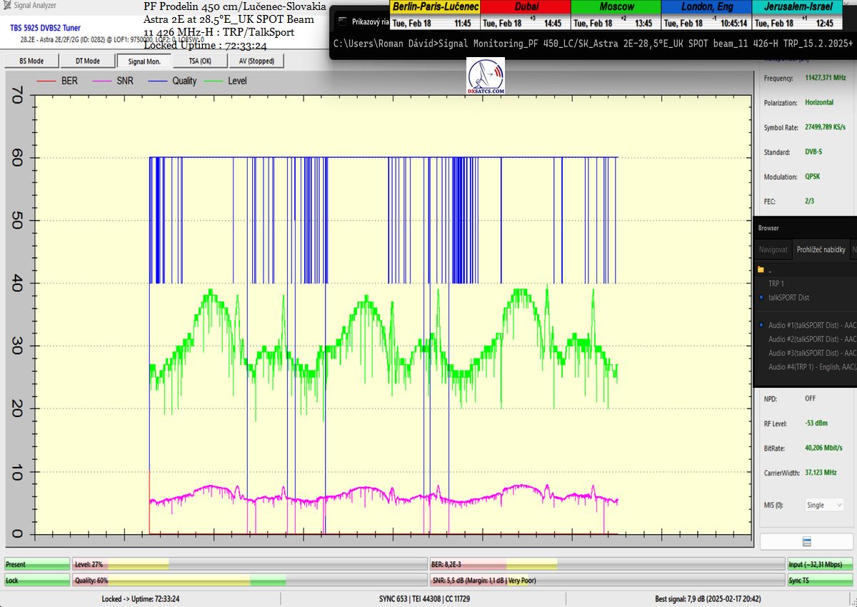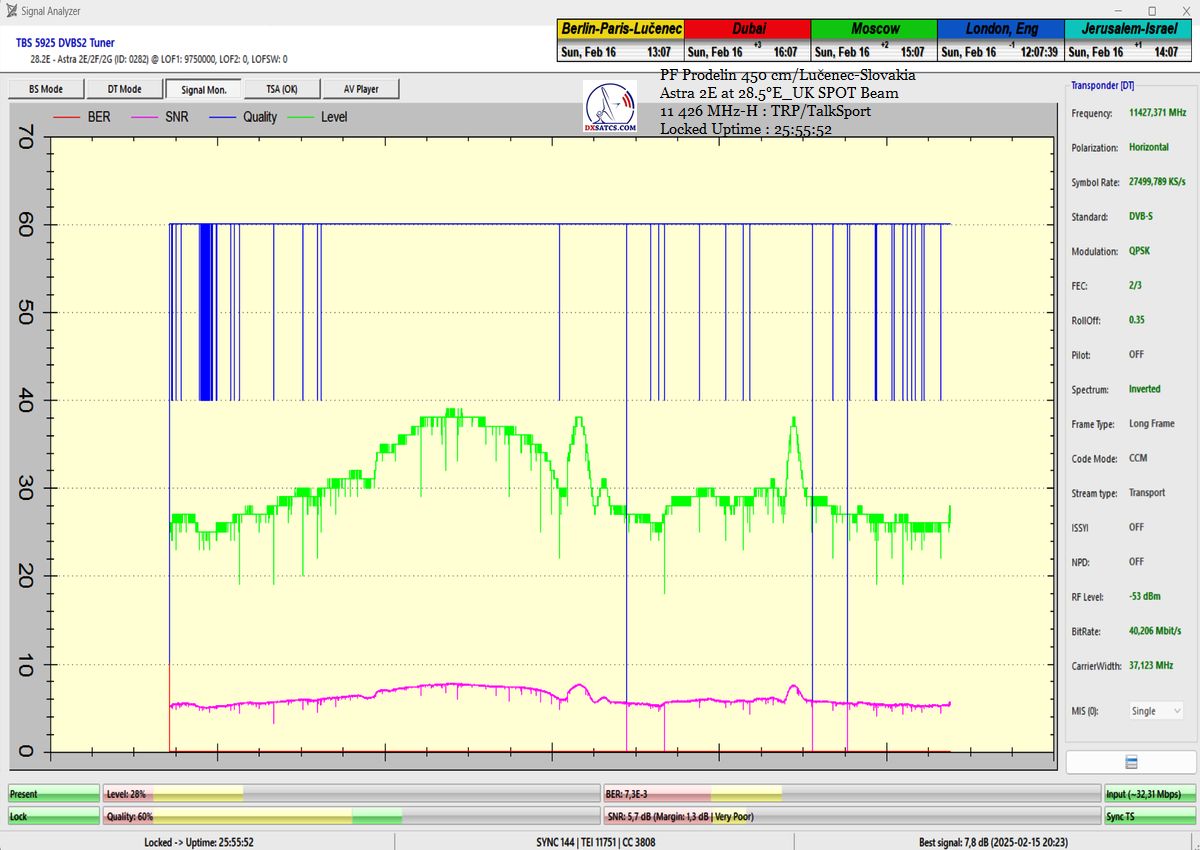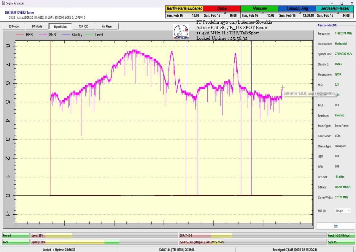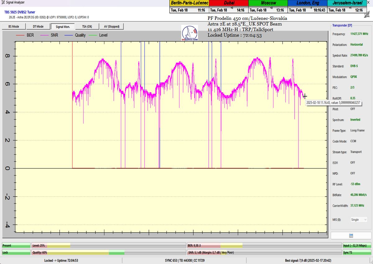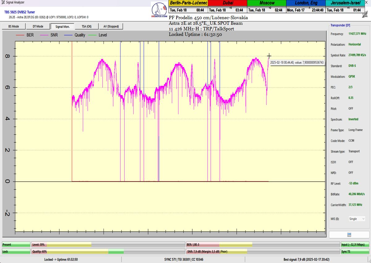 "Synchronisierte Nanokorrektur" beim Empfang des Transponders TP 115 von Satellit Astra 2E auf 28,5°E im UK SPOT BEAM-Bereich in Lučenec im Süden der zentralen