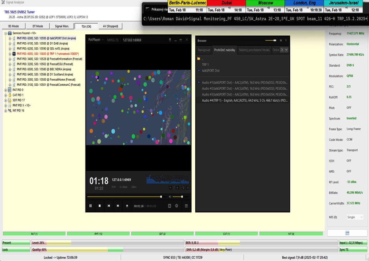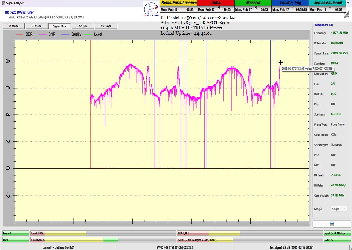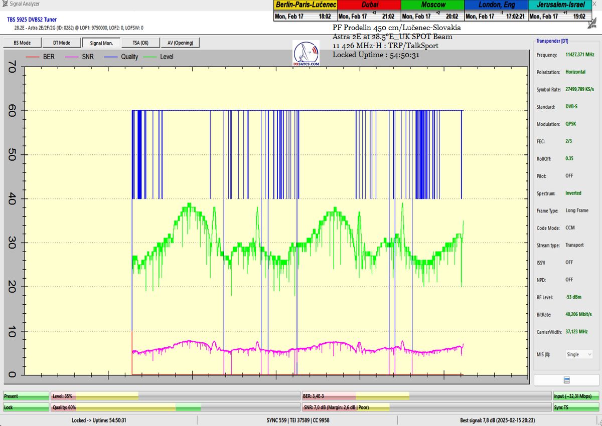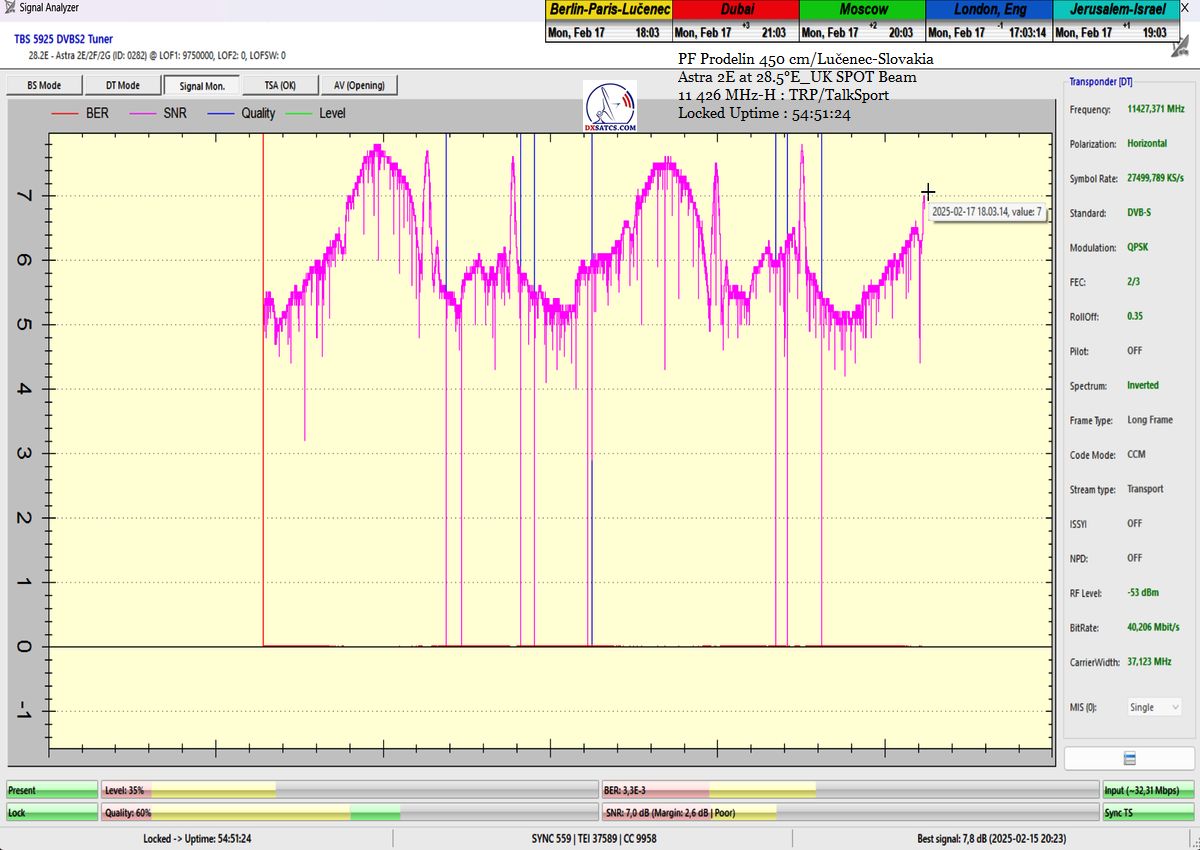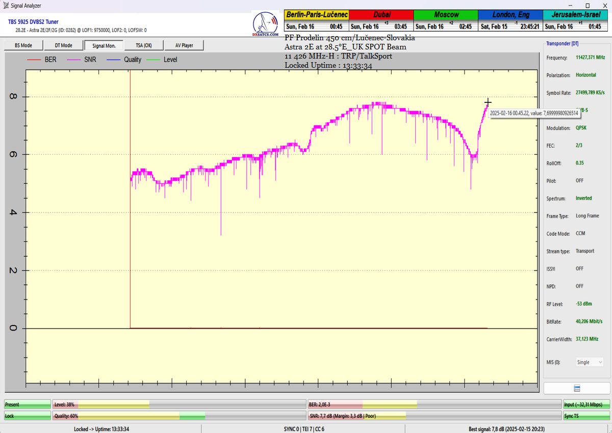 "Synchronisierte Nanokorrektur" beim Empfang des Transponders TP 115 von Satellit Astra 2E auf 28,5°E im UK SPOT BEAM-Bereich in Lučenec im Süden der zentralen