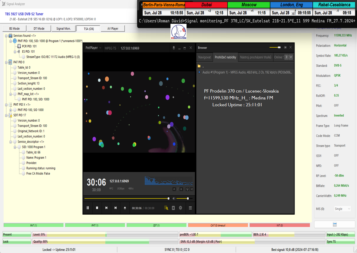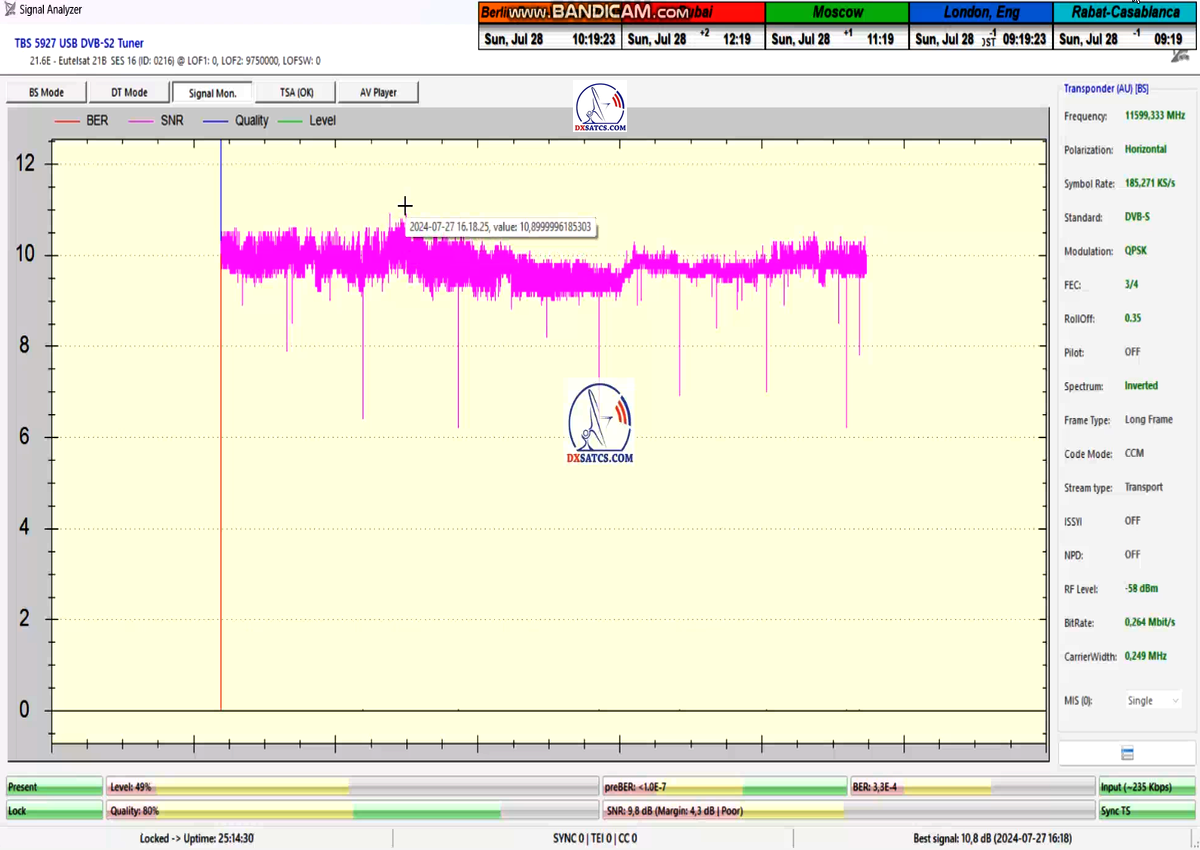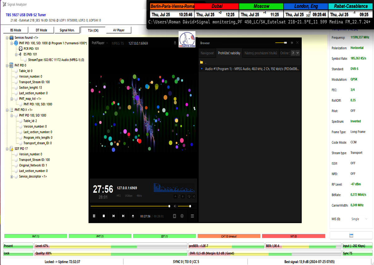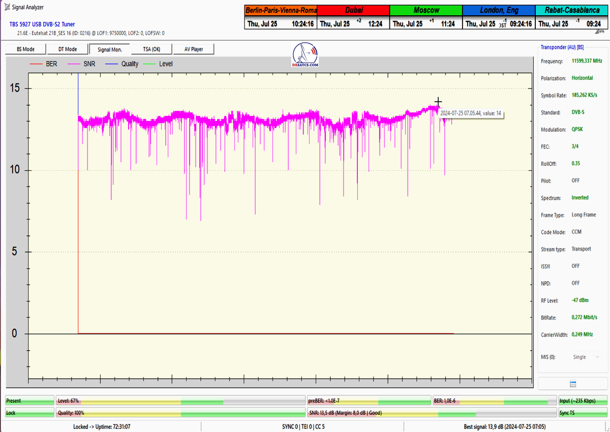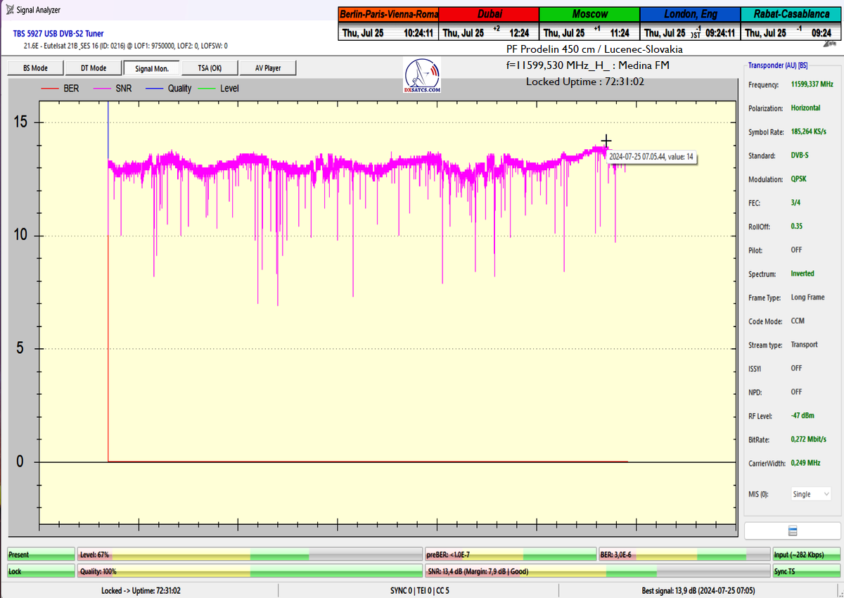 na f=11 599,530 MHz s aplikovanou hodnotou SR=185 ksym/sec,týmto nespochybniteľne dokazuje že som dosiahol stabilitu príjmu na 100% bez jediného výpadku v kontinuite