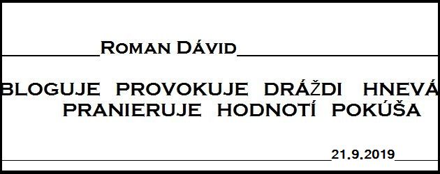 21.9.2019 : Roman Dávid opäť bloguje,provokuje,dráždi,hnevá,básni,pranieruje,bojuje za pravdu,hodnotí,vychvaľuje,kritizuje sám seba,navrhuje riešenia ale aj pomáha osobám z jeho sveta ...