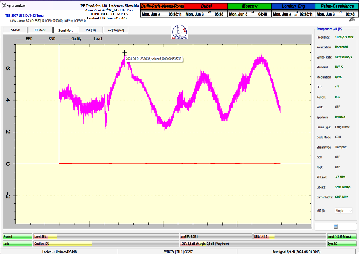 ►11 091 MHz_H _ METV_ plná stabilita príjmu až do t=50 hodín bola prerušená výpadkom Locku pri letnej búrke dňa 3.6.2024 od približne 15:40 do 17:00 CET