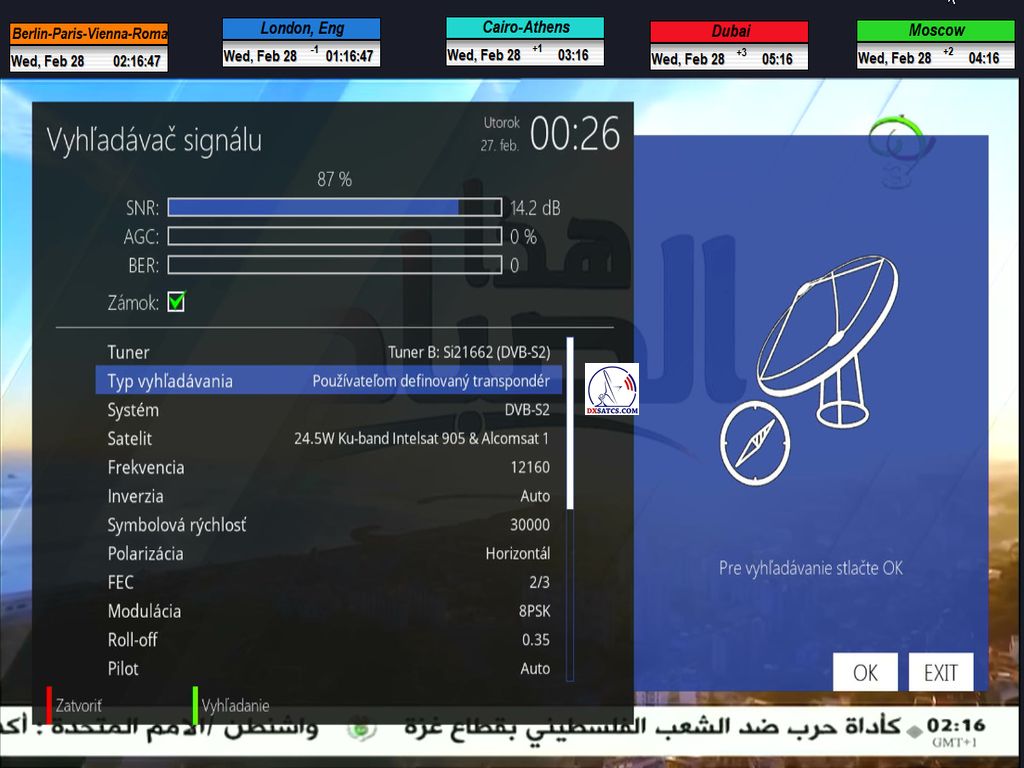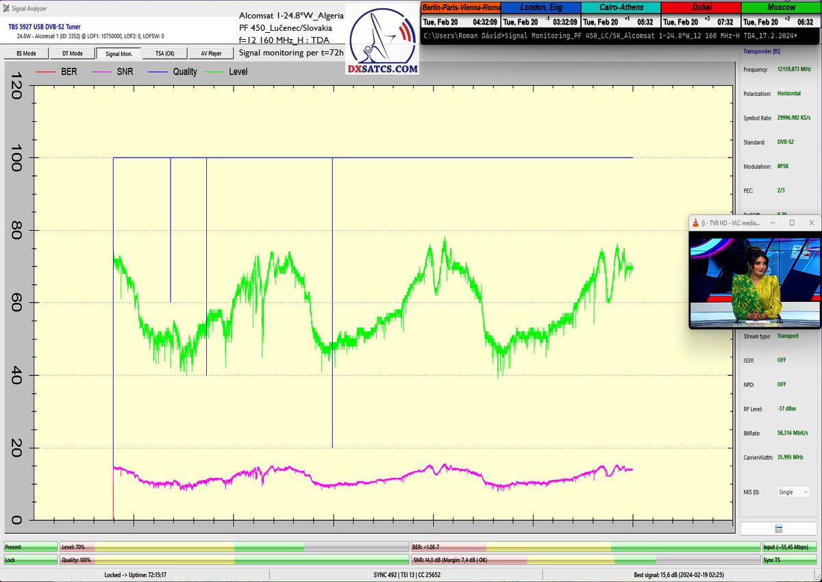 28.2.2024 : Author Roman Dávid is the first in Europe to achieve stable reception at 100% without a single dropout in the continuity of the Lock carrier with peak quality SNR=15.6 dB at the monitored frequency f=12 160 MHz in the geographical location of Central Europe and in the verification unit of t=72 hours with a reflector of a given diameter,provided by the Algerian provider TDA from the Alcomsat 1 satellite at 24.8°W.