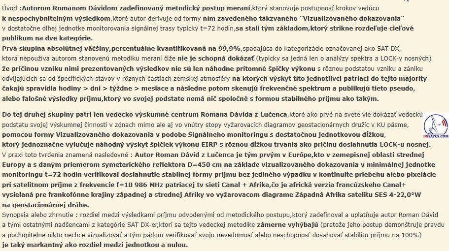 SK_Len správne zadefinovaný metodický postup meraní a zberu dát vedie k nespochybnitelným výsledkom,ktoré demonštrujú realitu satelitného príjmu v danej zemepisnej oblasti.Nesprávny,alebo tiež antimetodický a zavádzajúci postup odvodený len od publikovania samotných analýz frekvenčného spektra so zamknutými nosnými prenosu vedie výlučne len ku chybným výsledkom,úsudkom a nenaplneným očakávaniam.Antimetodické a zavádzajúce postupy sa dominantne a už desiatky rokov uplatňujú v amatérskej kategorizácii satelitného príjmu v zónach "Mimo stopy" označovaného skratkou SAT DX.