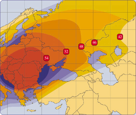 - umiestnenie RX zostavy v centrálnej zóne špičky EIRP toku s vyžiarenou úrovňou okolo 54-56 dBW umožňuje v kvalitatívnom vyjadrení jednotky Modulačná Chyba MER na príjmacej strane dosiahnúť výnimočné akostné rozpätia zisku od MER=18-24 dB pri FEC 3/4 čo je čistá hladina ziskového rastu od 12-18 dB nad pásmom uzamknutia QPSK nosnej pri MER=6 dB, pričom konkrétne v tomto prípade pri elevačnom uhle zostavy okolo 30° , čo následne súvisí s výsledným pomerom zisku k šumovej teplote G/T pri jednotlivých častiach RX signálneho reťazca ako anténneho reflektora , LNB atď. , je možné totálnu chybovú nulu BER na kanál=E-08 pred Vitterbi dekodérom resp.stanovenú energiu na bit dosiahnúť už pri MER=14+ dB a FEC 3/4 , čo by pri teoretickom predpoklade rovnakých hladín EIRP tokov z pozícií 4,0°W a 95,0°E v mieste príjmu Lučenec / so zanedbaním permanentného oscilačného rozkmitu amplitúdy Q-kvality vplyvom takmer nulového elevačného uhla / , v praxi znamenalo nemožnosť dosiahnutia porovnatelných kvalitatívnych výsledkov okamitej chybovosti BER na kanál a kvality MER prenosu s rovnakým RX signálnym reťazcom s PF 365 cm .