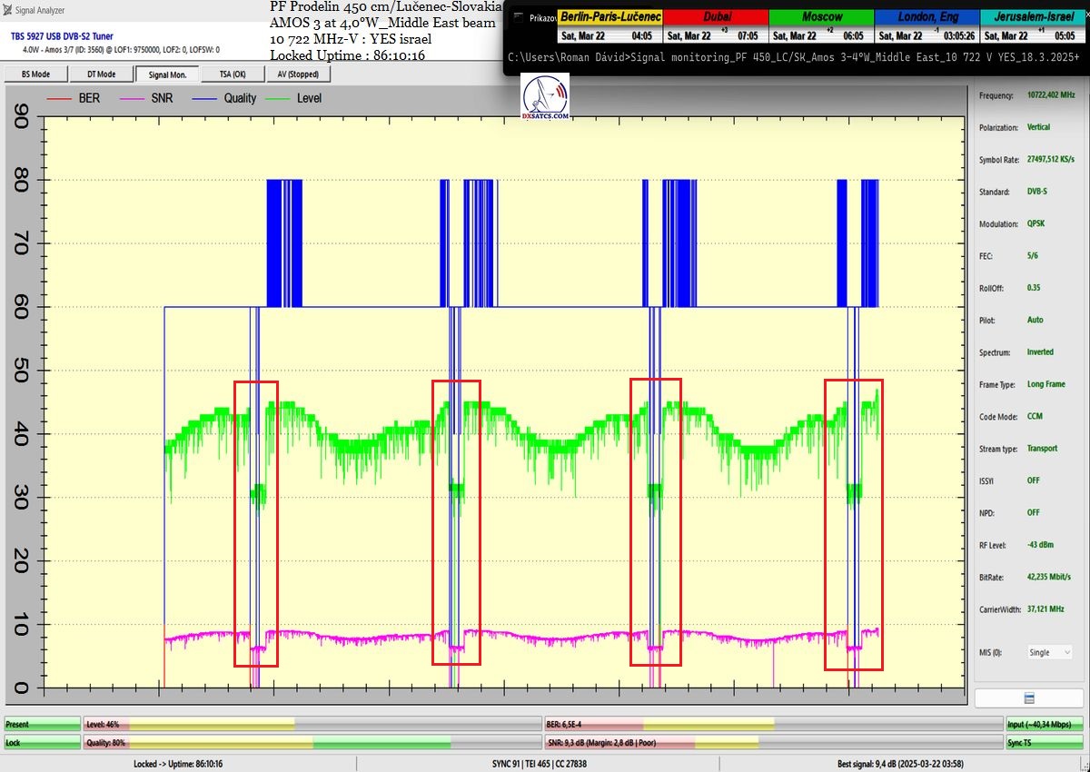 Počas viac než štyroch mesiacov systematického satelitného výskumu som zaznamenával opakujúcu sa a doposiaľ nevysvetliteľnú anomáliu v intenzite výkonu a kvalite signálu satelitných nosných izraelského poskytovateľa YES, ktoré sú vysielané prostredníctvom satelitu AMOS 3 na pozícii 4.0°W v pásme 10 722 až 10 926 MHz_V.