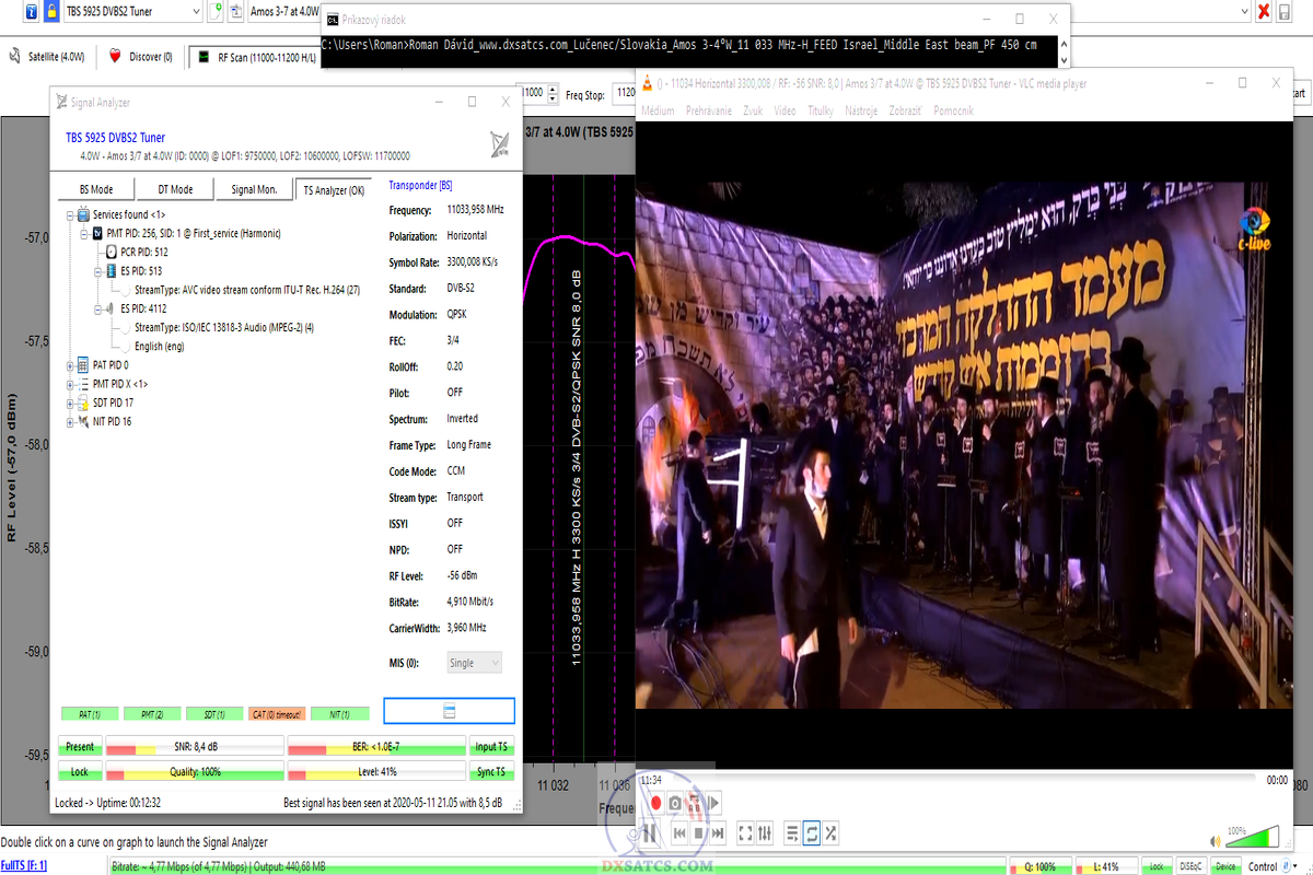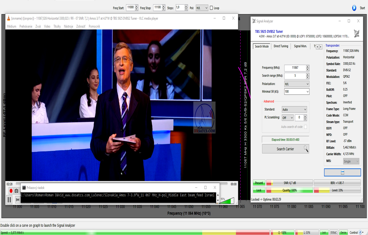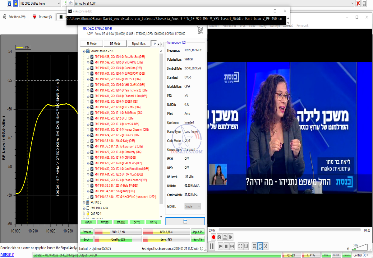 prenosu vo frekvenčnom spektre v definovanej zemepisnej polohe,na súčastnú a zároveň vôbec prvú demonštráciu uzamknutia a kvality príjmu nosnej izraelského tv paketu YES na f=11 554 MHz,ktoré kontinuálne,čiže bez výpadkov v možnosti uzamknutia,trvá od približne 6:00 ráno,už