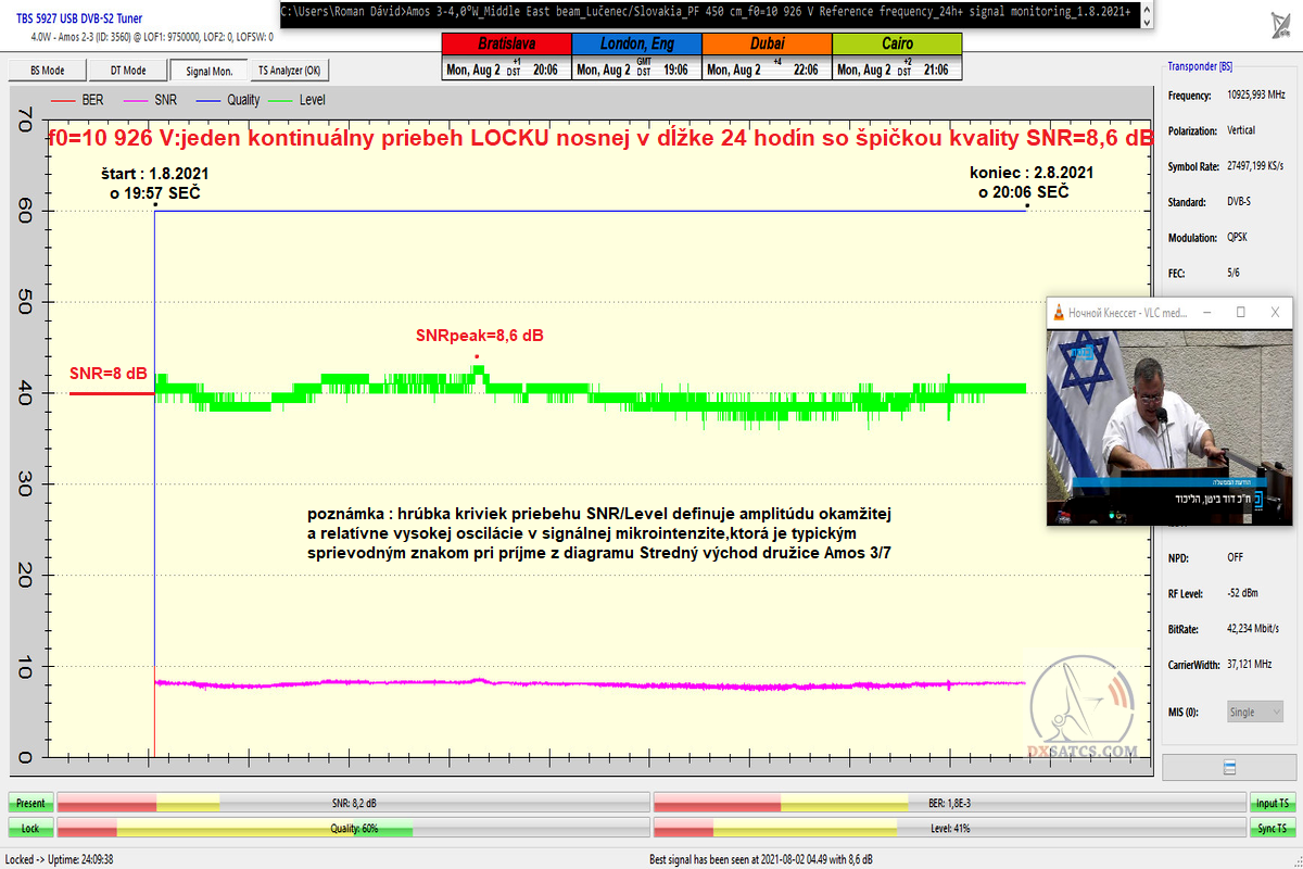 ⇒3,f0=10 926 MHz_V : pre geostacionárne objekty Amos 3/7 tak typický faktor takmer nepretržitej a relatívne vysokej oscilácia mikrovýkonupočas dňa,v celej stredoeurópskej zóne príjmu,od približne 10:00 do približne 19:00 SEČ sa demonštruje v HRÚBKE KRIVIEK PRIEBEHOV jednotiek SNR a Level v grafe signálneho monitoringu,čiže platí : Čím tenšia je krivka priebehov SNR/Level tým menšia je amplitúda okamžitej oscilácia mikrovýkonu a kvality v mieste analýz. V časovom úseku od približne 10:00 do približne 19:00 SEČ je možné neperiodicky identifikovať aj aplitúdu oscilácie v rozsahu SNR=+/- 0,5 dB čiže prakticky