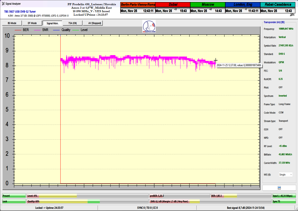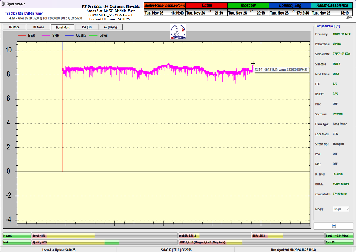 concerning the immediate signal availability of transmissions powerfully focused on the Middle East region at any second of the day. Thanks to my "Synchronous Nanocorrection" technology, there was a consistently low but stable signal margin of 1.0 to 2.5 dB/SNR during a monitoring period of t=80+ hours. Not once during this time did the signal approach the noise threshold for Lock at SNR=6.5 dB, and satellite reception remained fully stable, even under overcast skies with light rain showers.