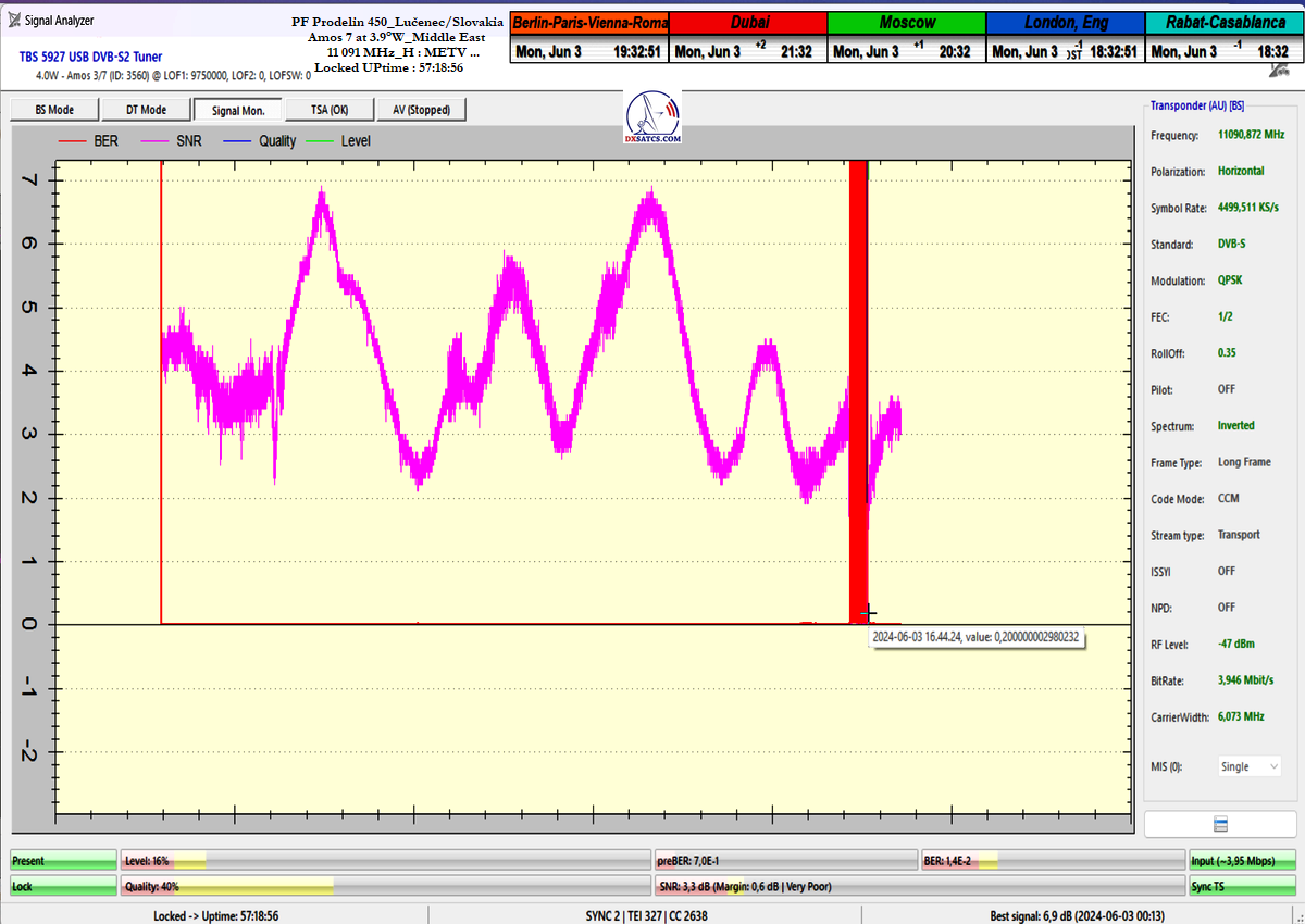►02, 11 091 MHz_H _ METV: Volle Empfangsstabilität bis t = 50 Stunden wurde durch einen Lock-Ausfall während eines Sommergewitters am 3. Juni 2024 von etwa 15:40 bis 17:00 CET unterbrochen Beweis Nr. 1-2 am Höhepunkt der SNR-Qualität = 6,9 dB + Beweis. Im Sommer 2024 arbeitete ich an einer kleinen Korrektur der Systemlösung im Brennpunkt der 450 cm PF-Antenne, und dabei testete ich die Genauigkeit meiner Verfahren für das Signalmonitoring von METV bei f = 11 091 MHz von Amos 7. Dadurch wurde mir klar, dass das Attribut der Referenzfrequenz von dieser Frequenz entfernt werden muss, basierend auf den Ergebnissen des Monitorings, und ich habe anschließend das Attribut der Referenzfrequenz f = 10 890 MHz_V dem gesamten Middle East-Diagramm zugeordnet.**