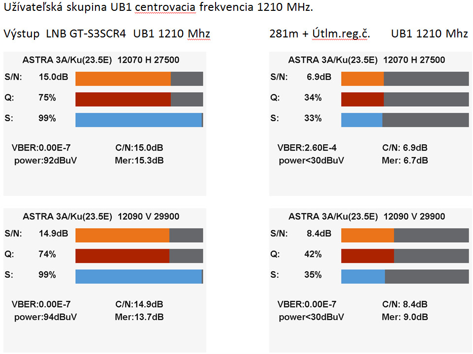 Užívateľská skupina UB2 frekvencia 1420 MHz - parametre straty výkonu na vedení sú identické ako u užívateľskej