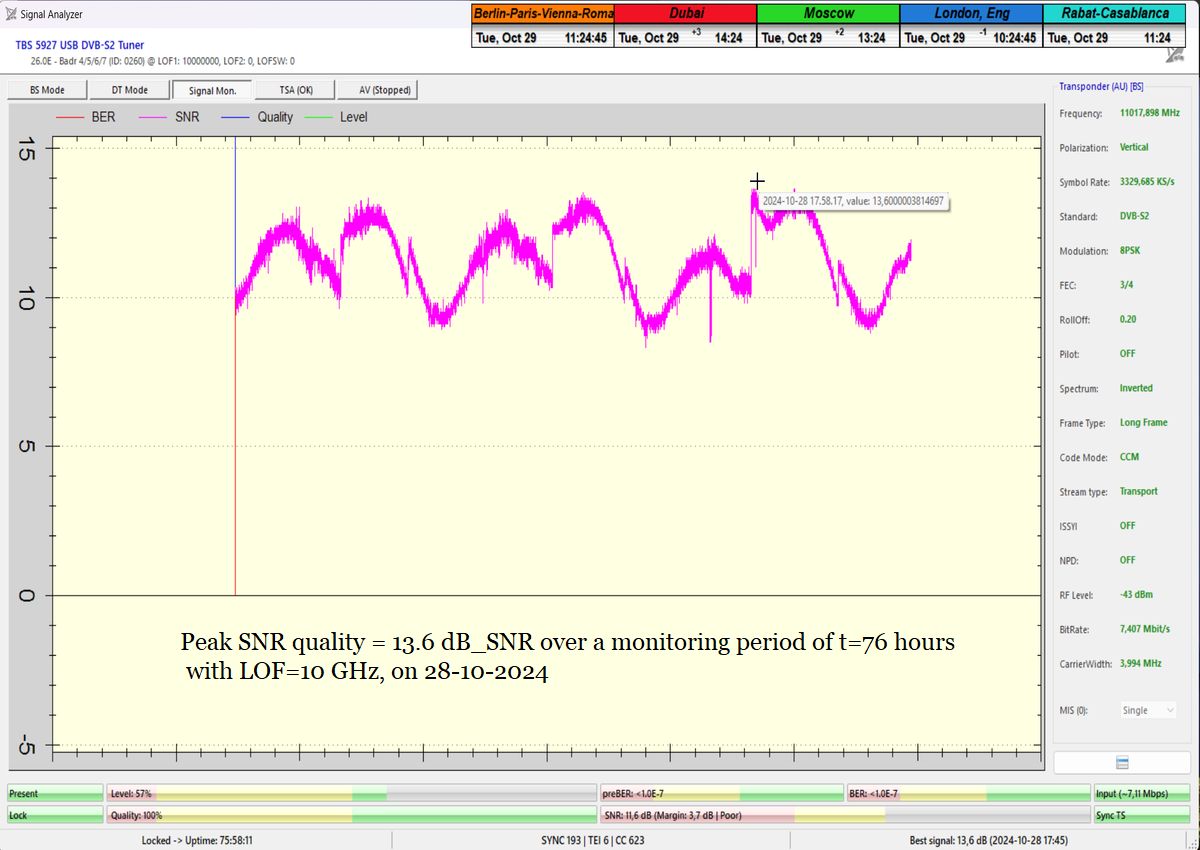 EN_Classification of achieved results at f=10,986 MHz: With the help of my original technological invention, named "Synchronous Nanocorrections," I indisputably achieved a stable carrier lock at 100% in a monitoring period of t=76 hours, without a single continuity dropout in its function. Depending on weather  conditions and the SMW-brand LNB used, peak quality ranged from 13.6 dB (at t=76 hours and LOF=10 GHz) to 14.2 dB_SNR (at t=21 hours and LOF=9.75 GHz).