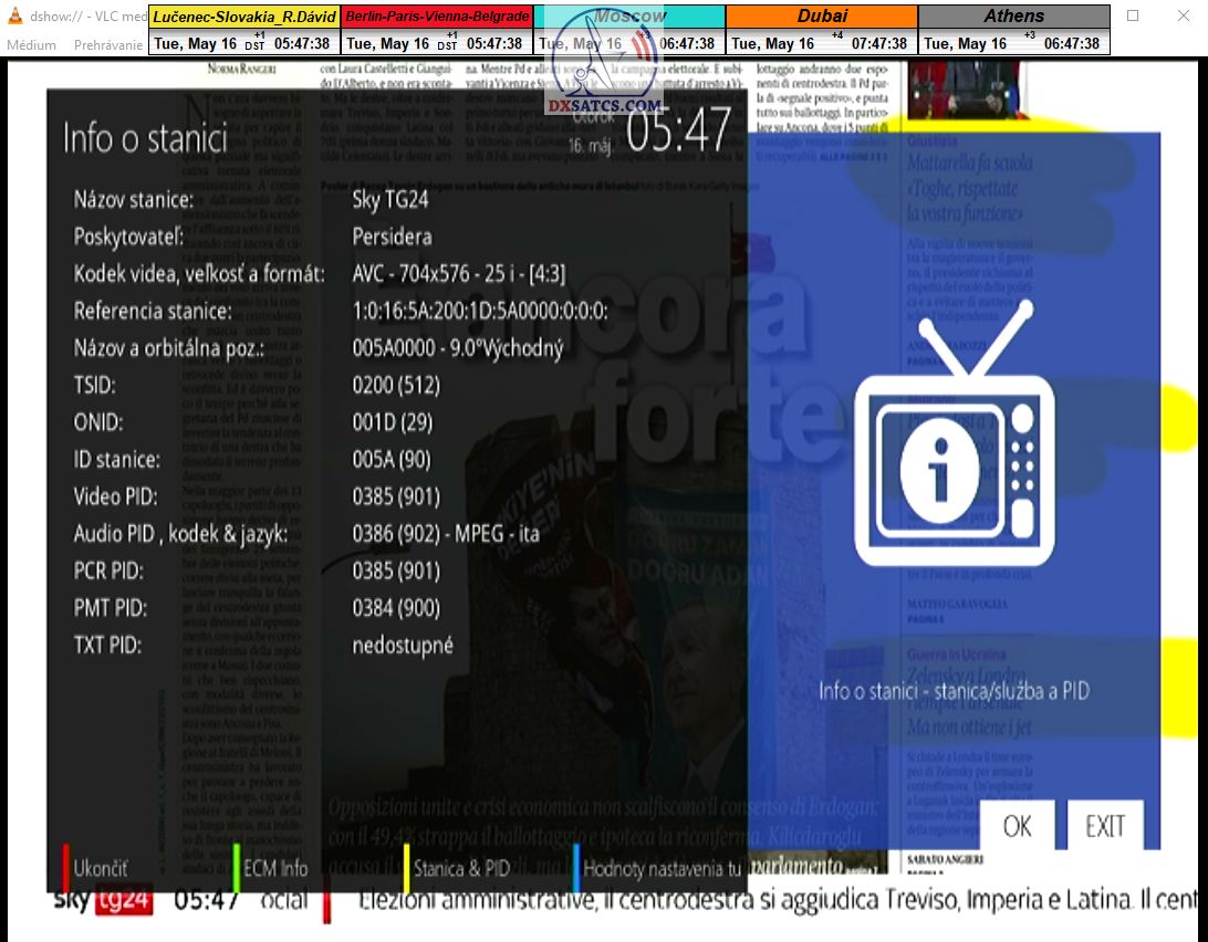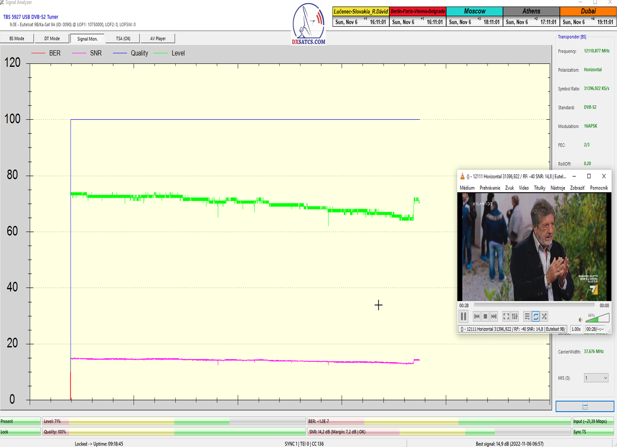 s verifikáciou stredoeurópskeho času v TV vysielaní,napríklad v SKY TG24,pretože to je dôkazom o reálnosti signálnej kvality,ktorú som v meste Lučenec dosiahol.Ak by niekto spochybňoval hladiny SNR zo samotného SW EBSpro,potom na dôkaz vyvrátenia týchto pochybností ponúkam ďalšie 3 signálne zdroje ako napríklad analyzátor Metek HD,4K receiver Octagon,SW CrazyScan a pochybnosti všetkého druhu sú razom blízke alebo rovné NULE. Ospravedlňujem sa za môj slovník určený pre publikum s určitou mierou "mentálnej invalidity alebo mentálneho postihnutia",ale občas je vhodné zopakovať si aj elementárnu abecedu,pretože  nie každý čitateľ pochádza z odbornej alebo vedeckej sféry a moje vysvetlenie smerujem aj do radov takzvaných