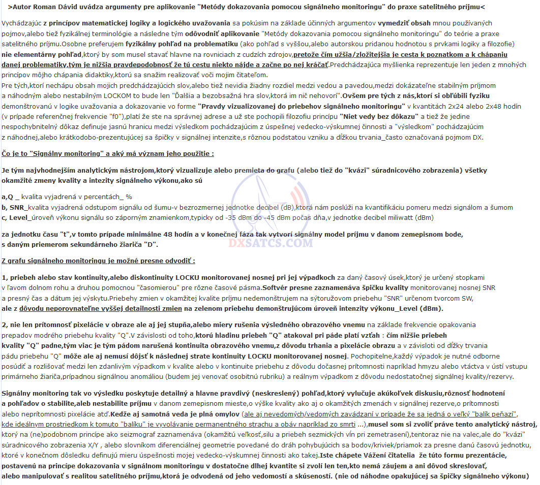 >Autor Roman Dávid uvádza argumenty pre aplikovanie "Metódy dokazovania pomocou signálneho monitoringu" do praxe satelitného príjmu