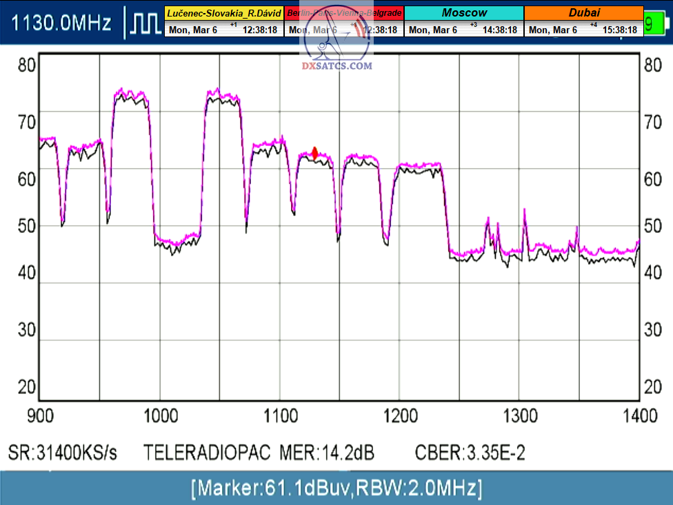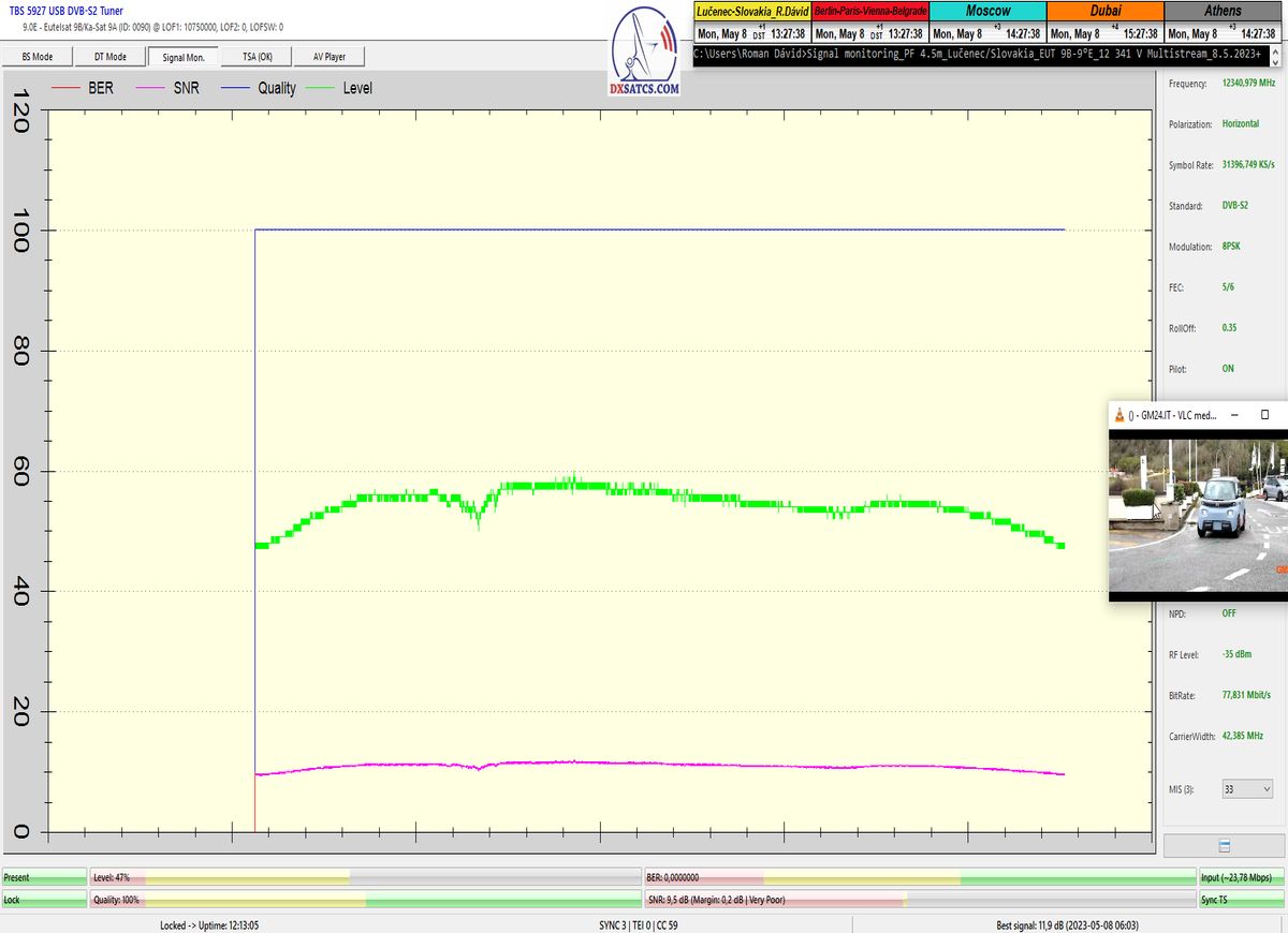 Priebežné stavy v signálnom monitoringu na f=12 341 MHz_V sa dokazujú v online video ukážkach,ktoré sa nedajú spochybniť.Kedže z principiálneho hľadiska platí že "Všetko sa dá spochybniť" moje argumenty znejú nasledovne : Signál s dostatočnou kvalitou sa nedá "svojpomocne vyrobiť " a priebehy a okamžité úrovne SNR,BER,Pwr... demonštrované v online video ukážkach sa nedajú zobrazovať a ani dodatočne upravovať v OFF-LINE režime,pretože ten neexistuje.To je dôvod prečo tak zdôrazňujem slovo ONLINE video ukážka