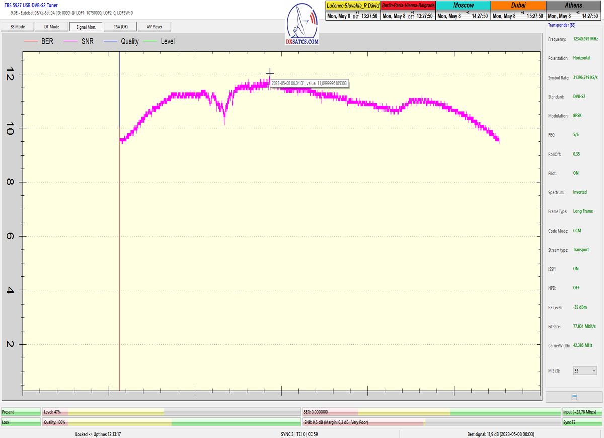 Terminológiou signálneho monitoringu a polopatisticky povedané : Vo výkonovom modele Jar/Leto dokážem (za predpokladu extrémne nedegradujúcich poveternostných podmienok) v praxi naplniť stabilnú formu príjmu v minimálnej a každodennej dĺžke t=12 hodín, odvodenú od minimálnej ale stabilenej výšky rezervy od 0,2 dB o 01:15 CET v noci až do 2,3 dB okolo 6:00 ráno.  Pravdivosť mojich predchádzajúcich tvrdení o stabilnej forme príjmu z f=12 341 MHz_V v minimálnej dĺžke t=12 hodín každý deň dokazujú 3 priebehy signálneho monitoringu vyhotovené od siedmeho do deviateho mája 2023 a tentoraz bez publikovaného dôkazu môžem potvrdiť že výška špičky kvality okolo SNR=11,8 dB a dĺžka "otvoreného" signálneho okna pre stabilný príjem je porovnatelná s rokom 2022,čiže z hľadiska intenzity výkonu EIRP medziročne nedochádza k prudkým zmenám v danom zemepisnom mieste.