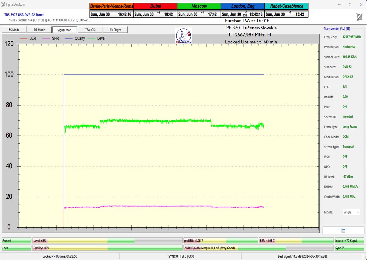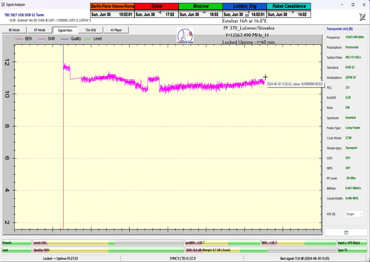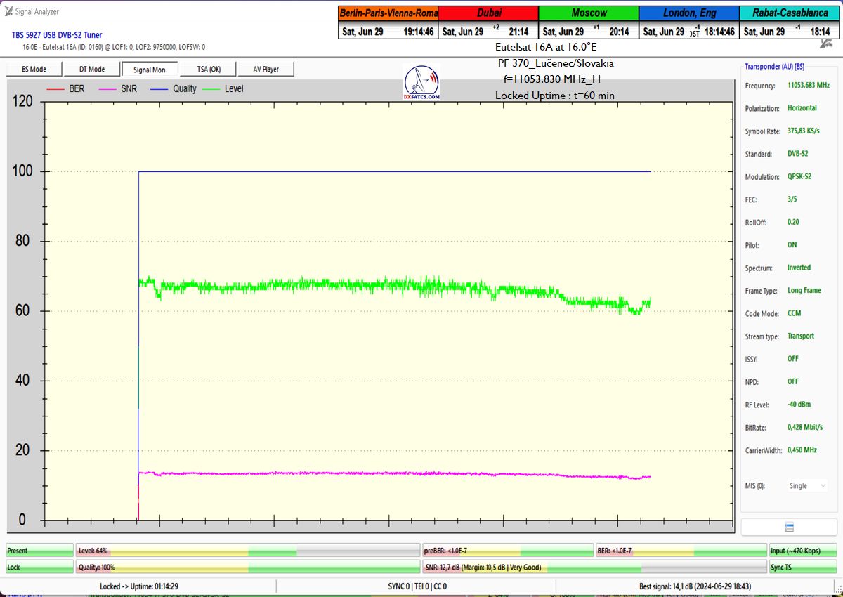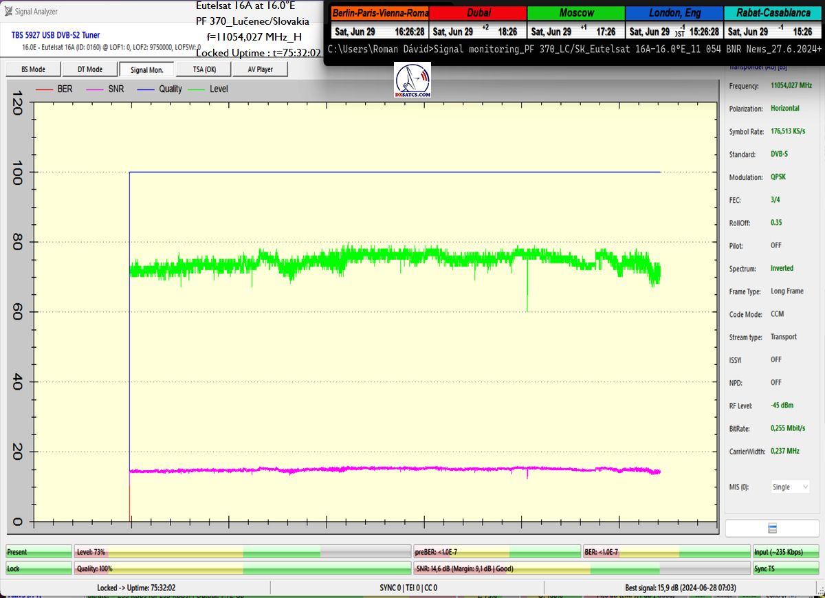 ►Klasifikácia dosiahnutých výsledkov na f=11 054,170 MHz: Dokazovanie v jednotke monitoringu t=75 hodín týmto nespochybniteľne verifikuje stabilitu príjmu na 100% pre rádio prenos s SR=176 ksym/s,čo je v priamom vzťahu so stabilne vysokou intenzitou výkonu okolo EIRP=49 dBW v stredoeurópskej zóne príjmu z vyžarovacieho diagramu EUROPE A na výstupe zo symetrického reflektora s D=370 cm s typickou výškou rezervy v kvalite príjmu okolo 9-10+ dB počas dňa.