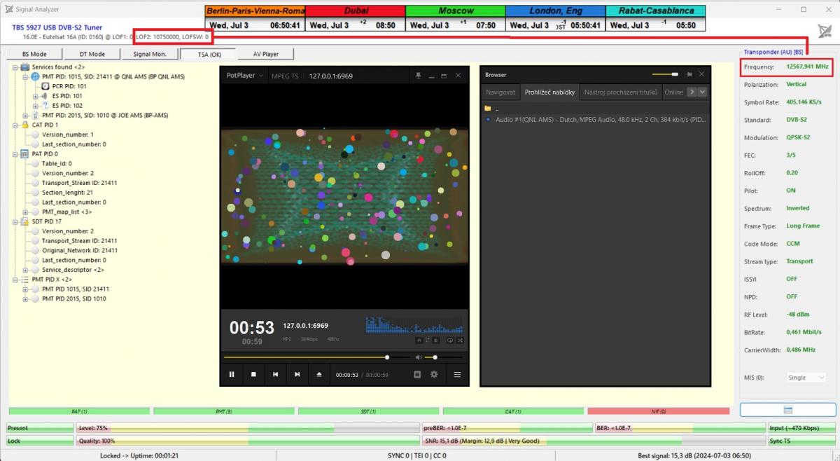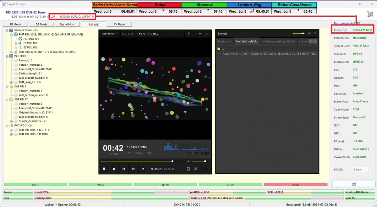 ►Stále platí moje tvrdenie z úvodu projektu,že HW/SW kombinácia TBS 5927 a EBSpro demonštruje vždy podladené frekvencie pre zámok nosnej s frekvenčným offsetom typicky od mínus 120 do 200+ kHz v závislosti od výberu oscilátora v LNB.Aj za predpokladu že v jednom konvertore PLL,v mojom prípade SMW Q-PLL-Type R,vyskúšate dva rôzne oscilátory_LOF1=10 750/LOF2=11 300,ktorých frekvenčné spektrá sa z veľkej časti prekrývajú (od 12 250 do 12 750 MHz),potom frekvenčný offset pre frekvenciu zámku môže predstavovať aj 20-50 kHz.Konkrétne som to testoval na rádio nosnej Q-Music NL AMS na f=12 567,994 MHz cez LOF2 a 12 567,941 MHz cez LOF1,čiže offset medzi dvoma oscilátormi pre frekvenciu zámku predstavoval presne 53 kHz.Pri každom pokuse o zámok sa môže spomínaný frekvenčný offset mierne meniť rádovo o jednotky kilohertzov v rámci jedného oscilátora a rádovo o desiatky kilohertzov pri zmene oscilátora,alebo LOF.Práve nesprávne zadefinovanie frekvencie ladenia, býva tou najčastejšou príčinou prečo sa niektorým z nás nedarí zamknúť niektoré nosné s nízkou Symbolovou rýhlosťou pod 200 ksym/s.