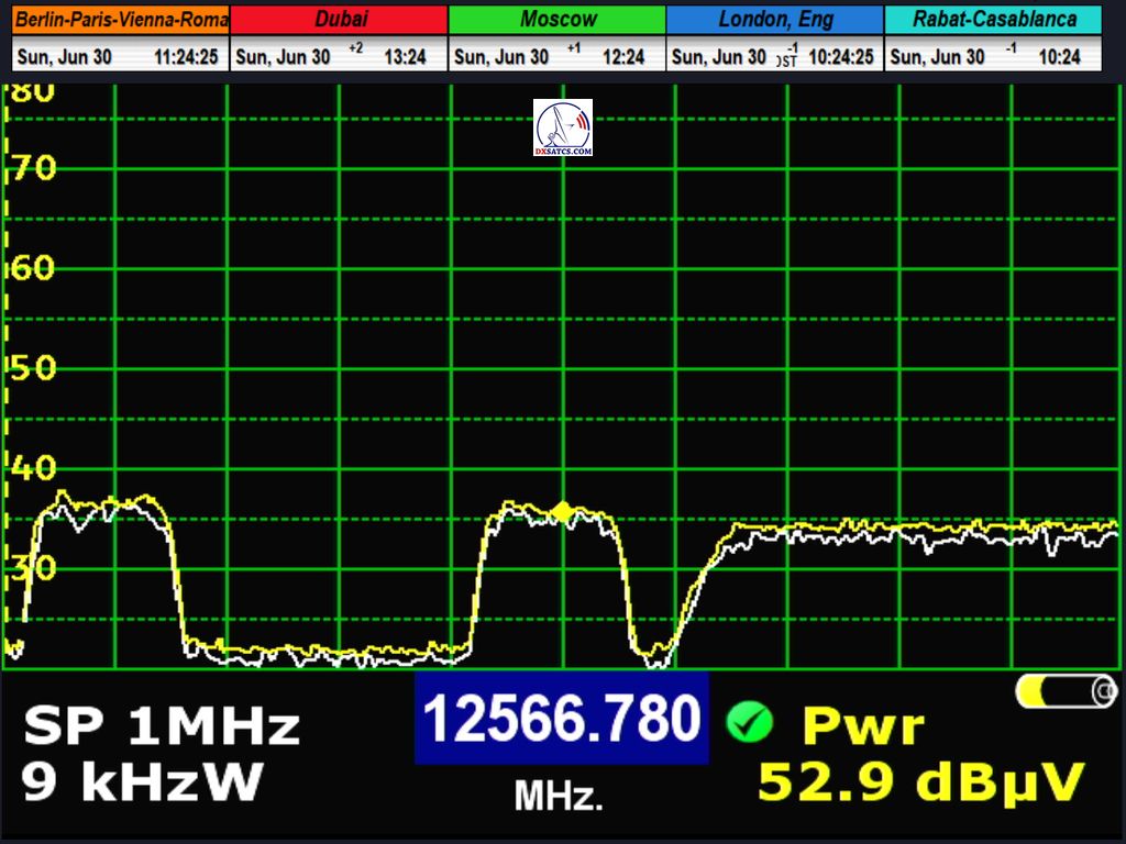 radio carrier Q-Music NL AMS at f=12,567.994 MHz through LOF2 and 12,567.941 MHz through LOF1, resulting in an offset of exactly 53 kHz between