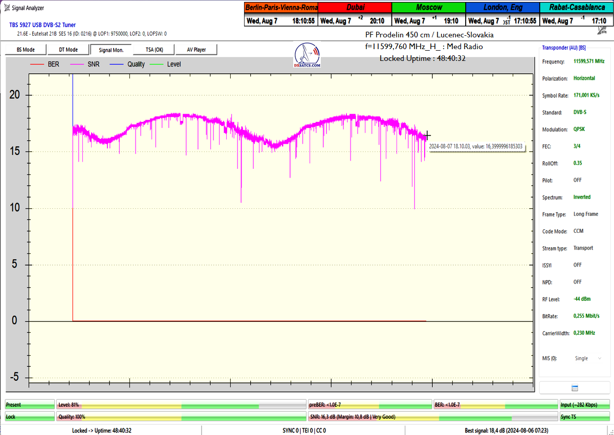 ►Eng_Classification of achieved results at f=11 599,760 MHz: Signal monitoring over a unit length of t=72 hours irrefutably proves that I have achieved 100% reception stability in practice, without a single interruption in Lock continuity throughout the entire monitoring period. The daily peak quality oscillated around an SNR of 18.4 dB, which provides an immediate quality margin of nearly 13 dB with, of course, a zero level of Viterbi Precorrection <1.0E-7. Occasional drops in instantaneous quality never exceeded an SNR of 9.7 dB.