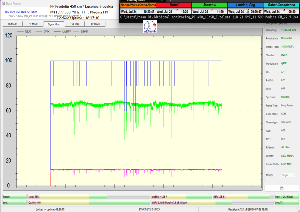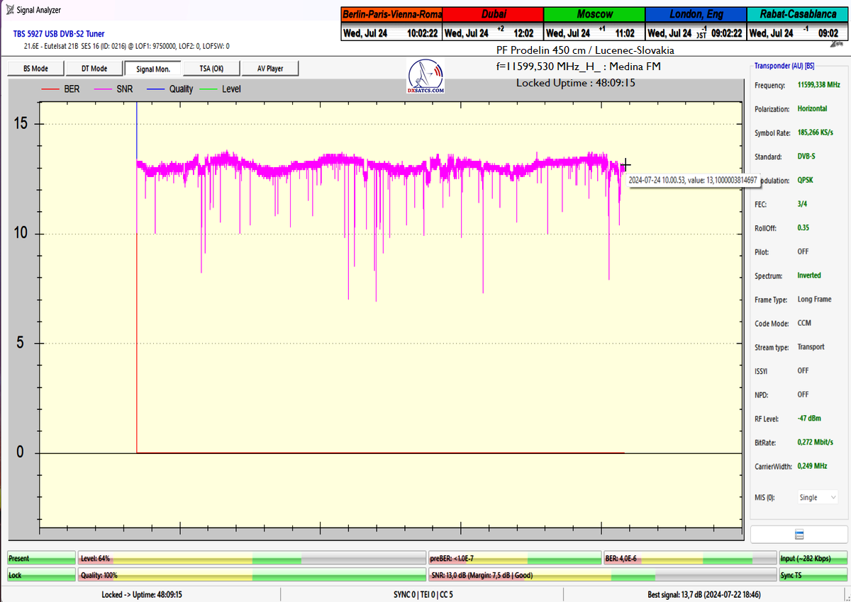 ►Klasifikácia dosiahnutých výsledkov na f=11 599,530 MHz: Vizualizovaná forma dokazovania v celkovej jednotke monitoringu t=97 hodín na rádio nosnej Medina FM na f=11 599,530 MHz s aplikovanou hodnotou SR=185 ksym/sec,týmto nespochybniteľne dokazuje že som dosiahol stabilitu príjmu na 100% bez jediného výpadku v kontinuite Locku nosnej so špičkou kvality SNR=14 dB,pri typickej a permanentne oscilujúcej aplitúde okamžitej rezervy v rozsahu od 7 do 8,5 dB.Vysoký počet v grafe vizualizovaných prepadov v intenzite výkonu a následne kvality,ktoré nijako nesúvisia s prípadným tienením traektórie elektromagnetického vlnenia z družice,(pretože sa opakovali aj na PF 370 s výhľadom na 100% nie len na PF 450 cm)nikdy nedosiahli šumový prah a oscilovali v pásme relatívne vysokej rezervy kvality príjmu.Obsadenie TP DW7 sa zmenilo,v porovnaní s naposledy vykonaným signálnym monitoringom nosnej Medina FM dňa 26.9 > 27.9.2023 + 6.10.2023 > 7.10.2023,čiže nemá význam porovnávať a prípadne vysvetľovať príčiny výrazného rastu dosiahnutej špičky kvality z pôvodnej hladiny SNR=11,4-11,6 na súčasnú špičku SNR=13,9-14 dB,ale faktom ostáva že LNB SMW ostal rovnaký a že som pôvodne použitú polarizačnú výhybku SMW OMT vymenil za : "Romanom Dávidom navrnuté systémové riešenie z roku 2008 tvorené len jedným kusom zlievarenského odliatku (nie z CNC alebo sústruhu),s fyzikálnymi úpravami,ktoré minimalizujú akékoľvek odrazy vlnenia,maximalizujú jeho signálnu priepustnosť,pri vysokej vodivosti tubusu,s konkrétnym zameraním na prevedenie vlnovodnej príruby "