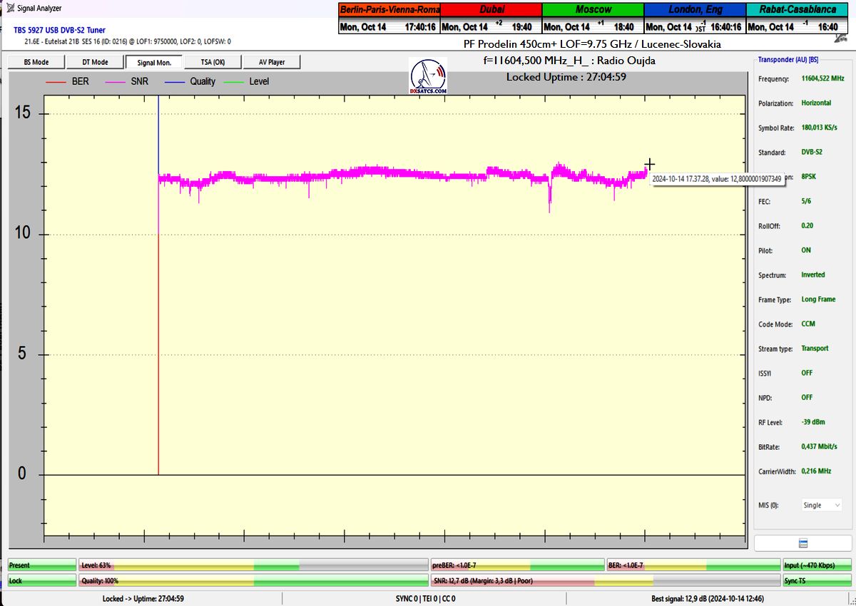 SK: EUT 21B_11 604,500 MHz-Radio Oujda : Dokázaná kontinuita funkcie locku,alebo stabilita príjmu na 100% na výstupe z PF 450+370 cm na každom z troch oscilátorov v celkovej kvantite dokazovania t=144 hodín,pre rádio nosnú s aplikovanou hodnotou Symbolovej rýchlosti SR=180 ksym/s a so špičkou kvality SNR=13,7 dB