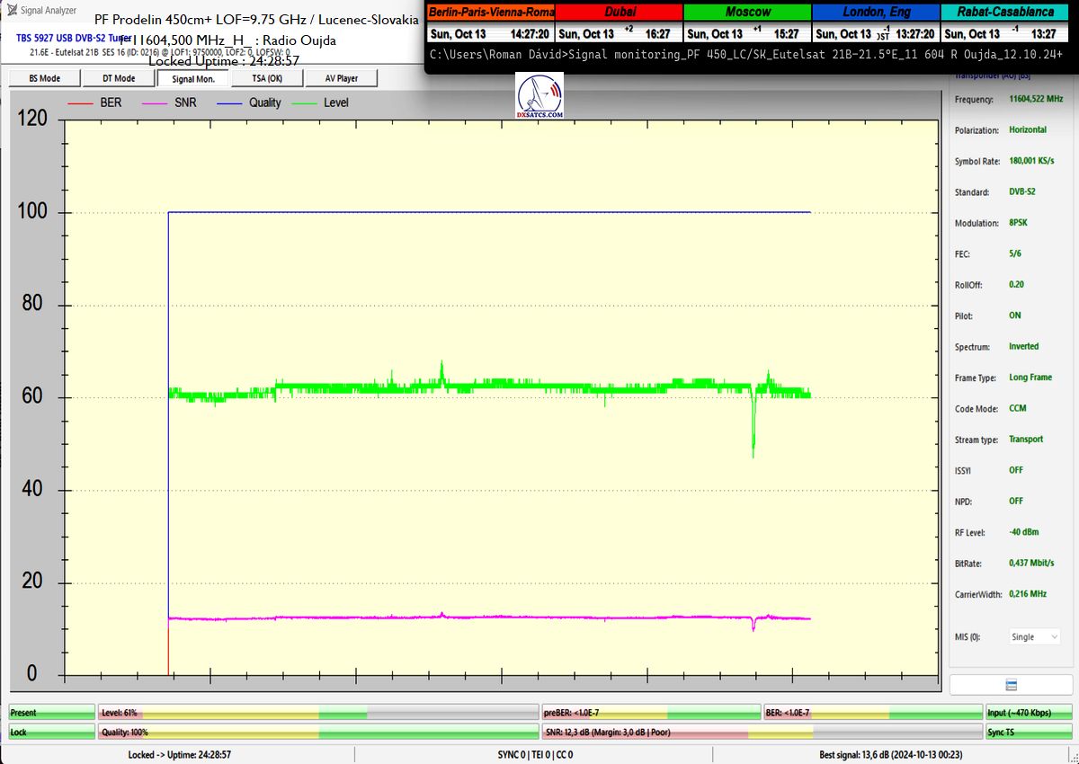 EN:This is the very first course of proof over a minimal unit of t=24 hours with LOF=10 GHz at the output of PF 370 cm, where I achieved an exemplary performance without even a single drop in the blue quality curve (Q) from the level Q=100%, with a minimal C/N margin of 9.4 dB for carrier lock with the applied parameter SR=180 ksym/s. The signal margin throughout the day oscillated in a typical range from 0.5 to 2.0+ dB, which is why I classify this proof as non-replicable over a longer monitoring unit, for example, t=48-72 hours, and under slightly worsened weather conditions. With a probability bordering on certainty, I would not achieve this exemplary result again at the output of PF 370 cm during a monitoring unit of t=48-72 hours, because the signal margin would subsequently oscillate and reach the noise threshold at a minimal C/N margin of 9.4 dB for carrier lock. In short, an objective result requires a longer time period for the monitoring unit and slightly worse weather conditions, not the almost ideal ones that occurred exceptionally during this monitoring in the city of Lučenec.