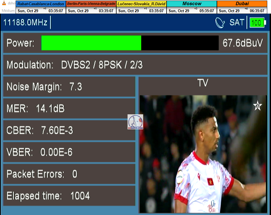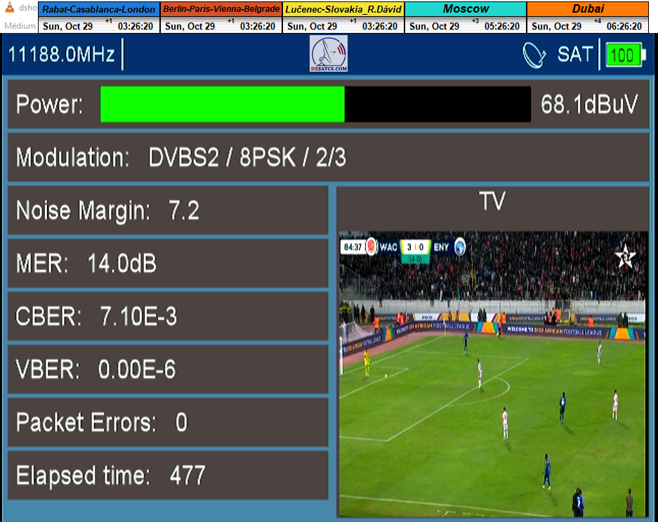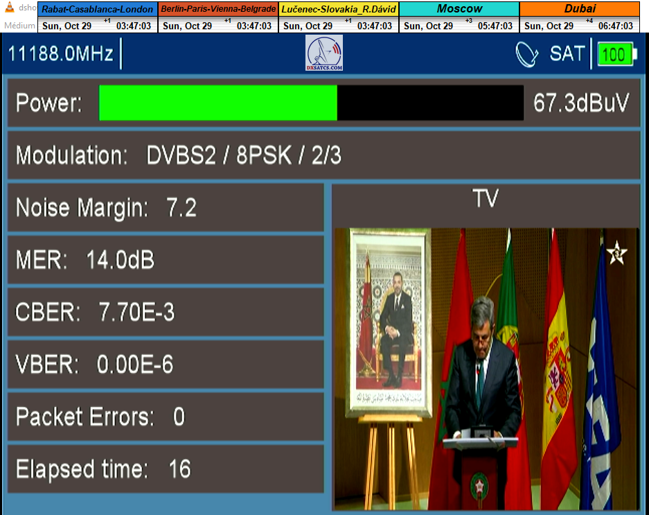 v štandarde DVB-S2/8PSK,dnes dokážem dosiahnutie exemplárneho stavu aj pri vysokom úhrne zrážok na frekvencii marockého provajdera SNRT Arryadia