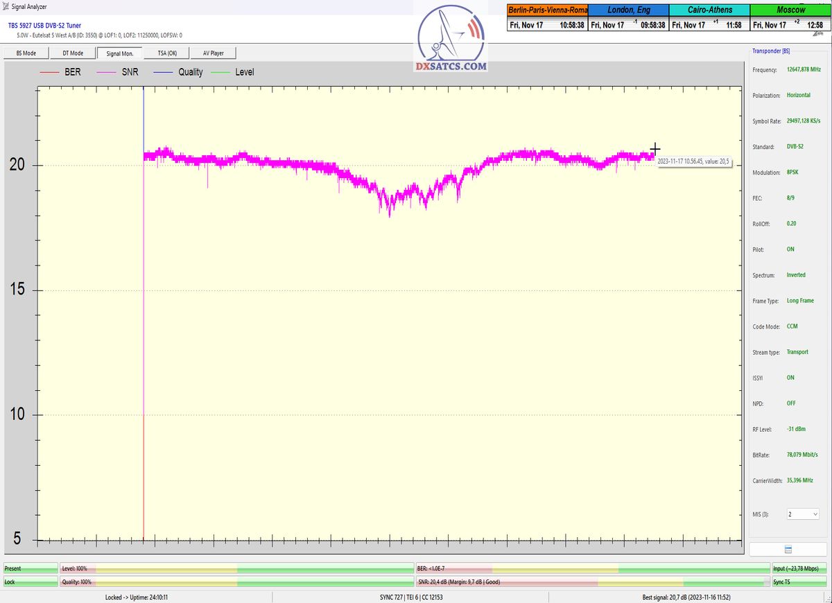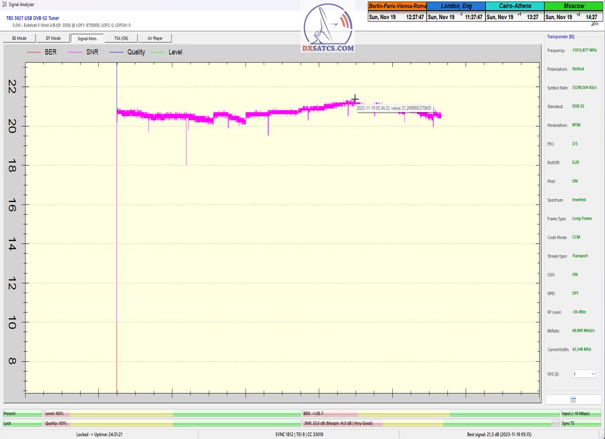 ►►Eutelsat 5 West B at 5.0°W-Transalpine-Multistream : Proving in the monitoring unit t=24 hours