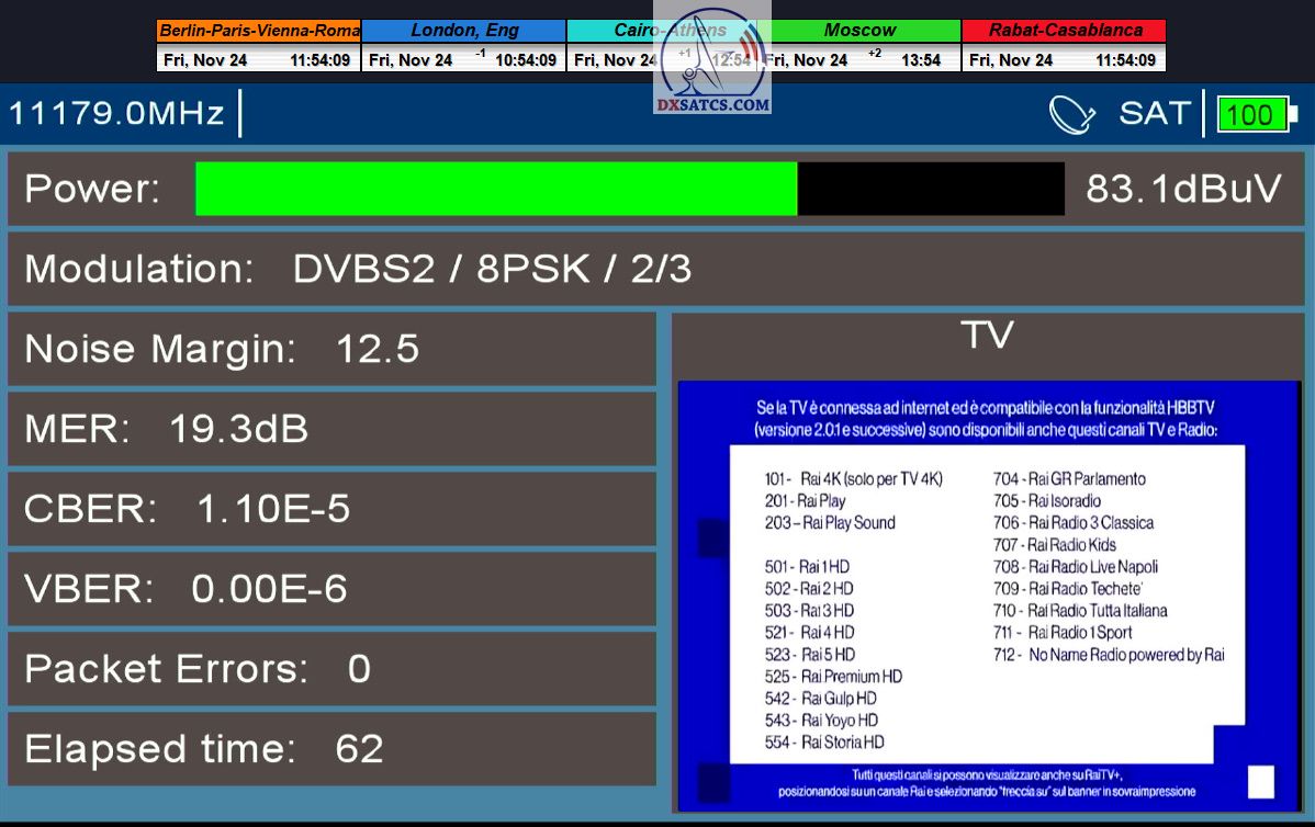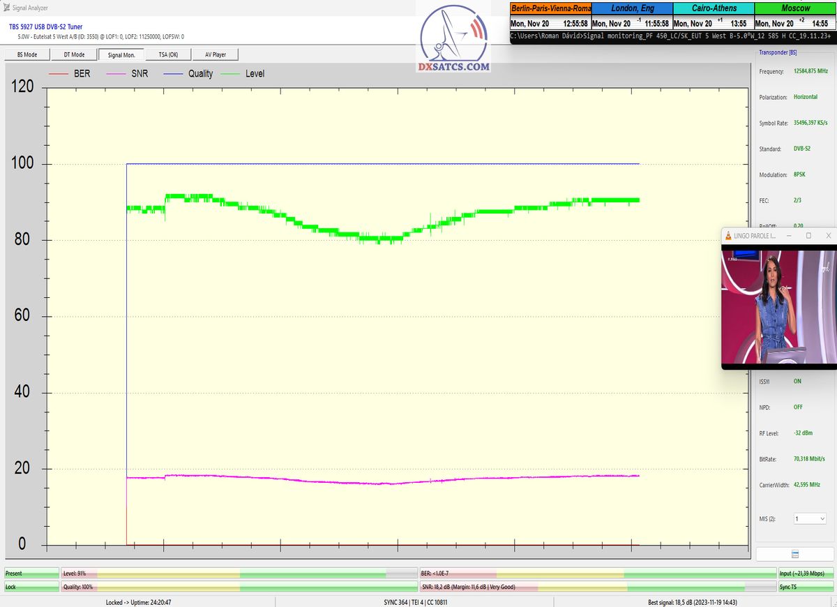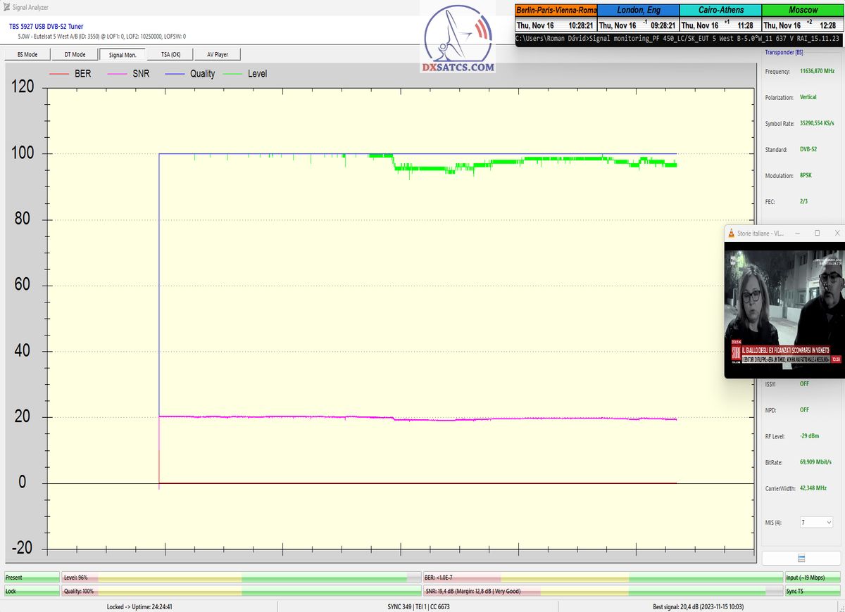 Na príklade dokazovania v podobe signálneho monitoringu paketov Rai a Canal+,vysielaných v technologickom štandarde DVB-S2/Multistream z objektu Eutelsat 5 West B na 5,0°W,Vám dnes dokážem že som účinne a hlavne stabilne transformoval relatívne vysokú intenzitu vyžiareného výkonu EIRP na výslednú kvalitu ,ktorú kvantifikujem pomerom signálu k šumu SNR=20>21+ dB-pri aplikovanej konfigurácii modulačných