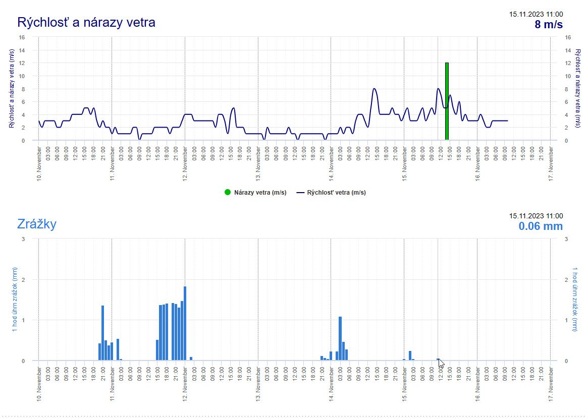 ►Results of wind speed and precipitation measurements for the location of the automatic meteorological station in the village of Boľkovce near Lučenec,spanning from November 13 to November 21, 2023, demonstrate that precisely in five out of the eight monitored intervals, monitoring activity was accompanied by rain showers with varying precipitation amounts. (source : shmu.sk)
