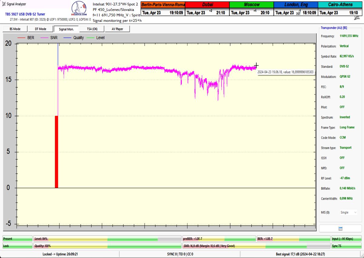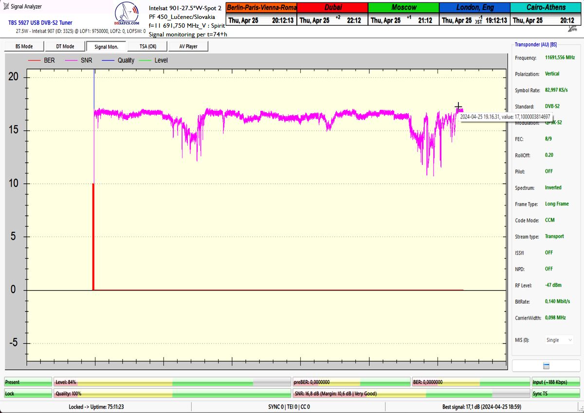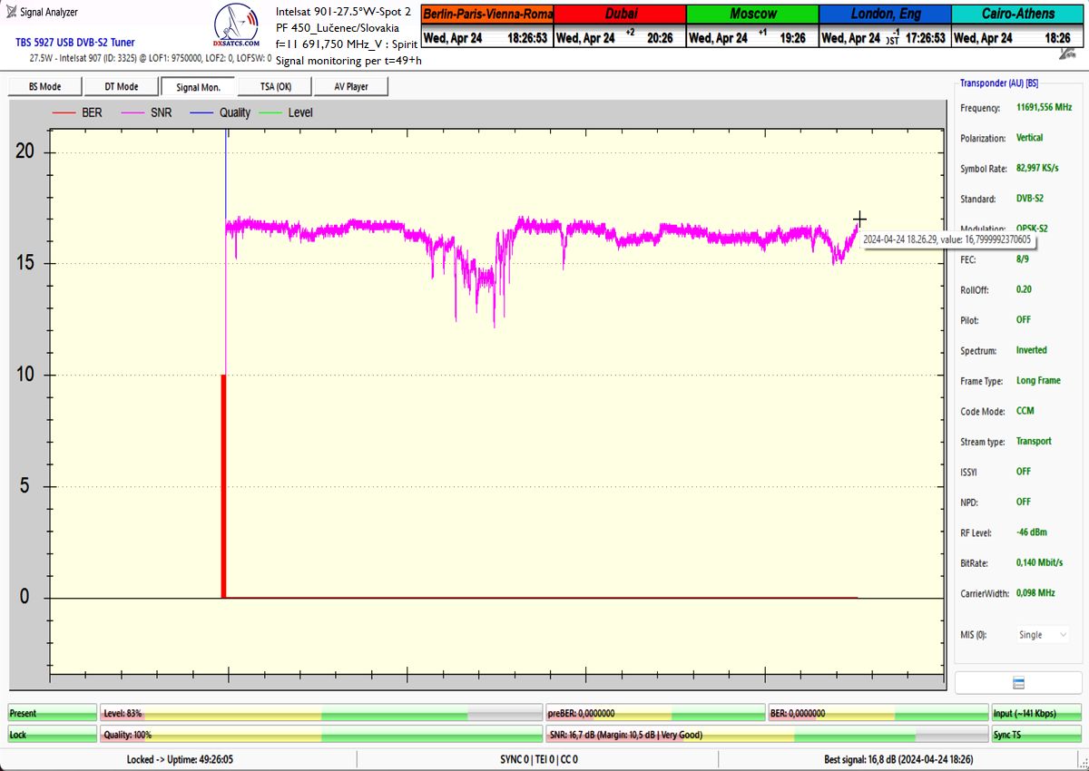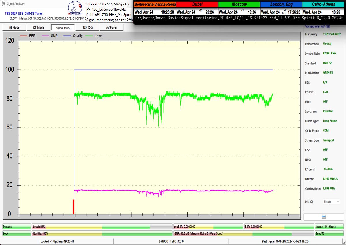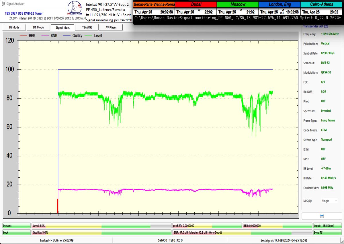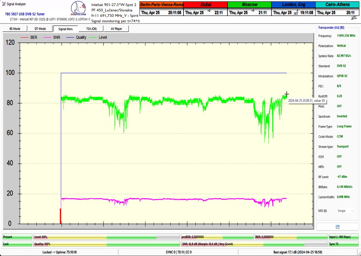 das Erreichen eines stabilen Empfangs (100%) auf der Frequenz f=11 691.750, die Spirit Radio mit SR=83 ksym/s belegt. Die volle Stabilität des Satellitenempfangs wurde selbst unter widrigen Wetterbedingungen,speziell am 24. April 2024,bestätigt. Die Spitzenqualität schwankte während