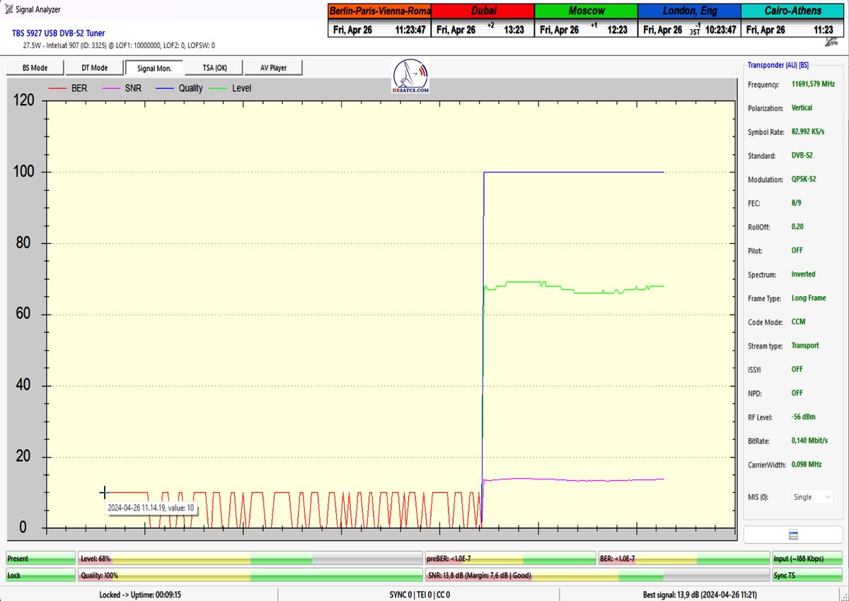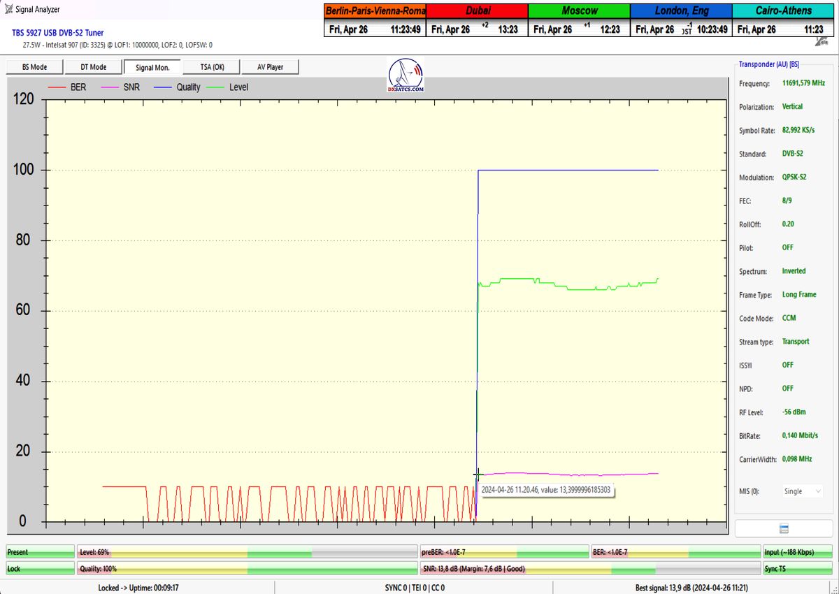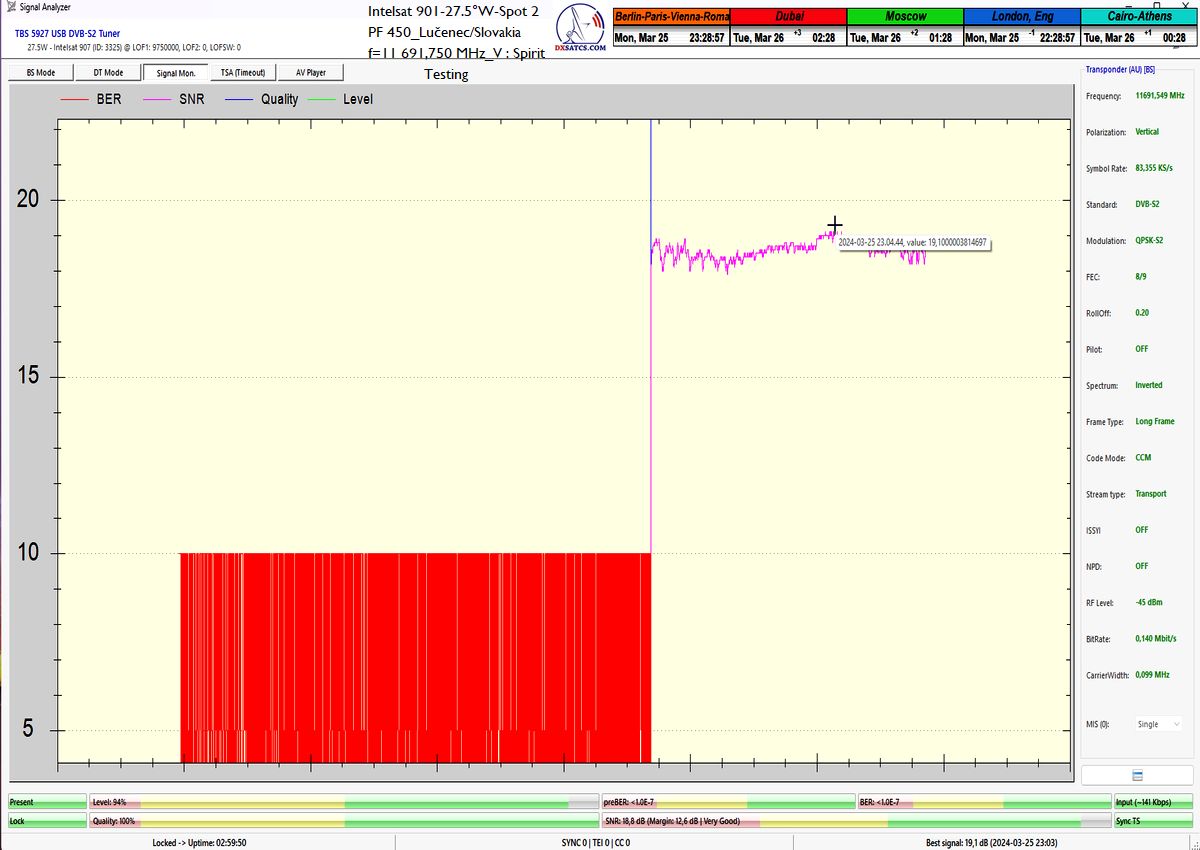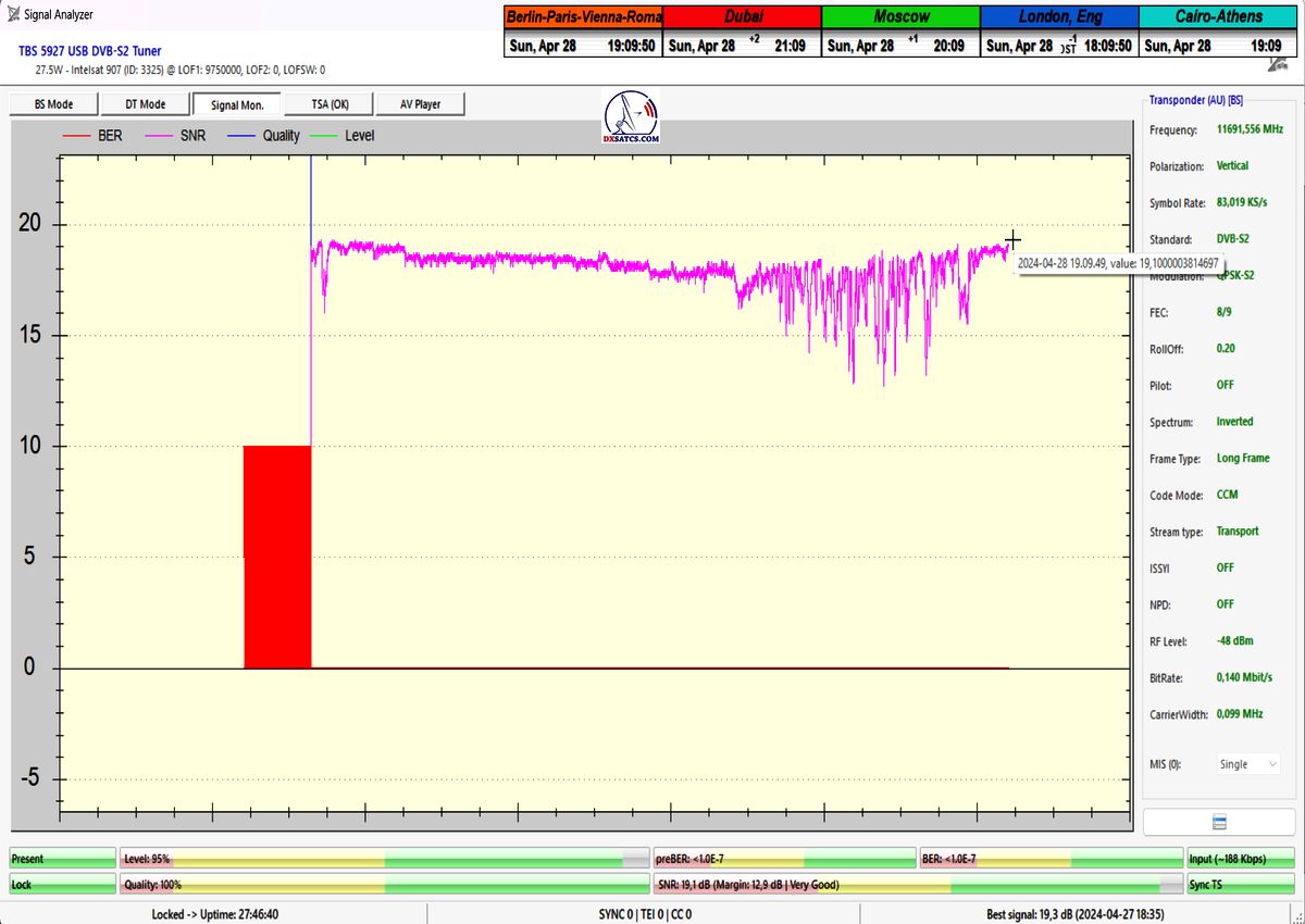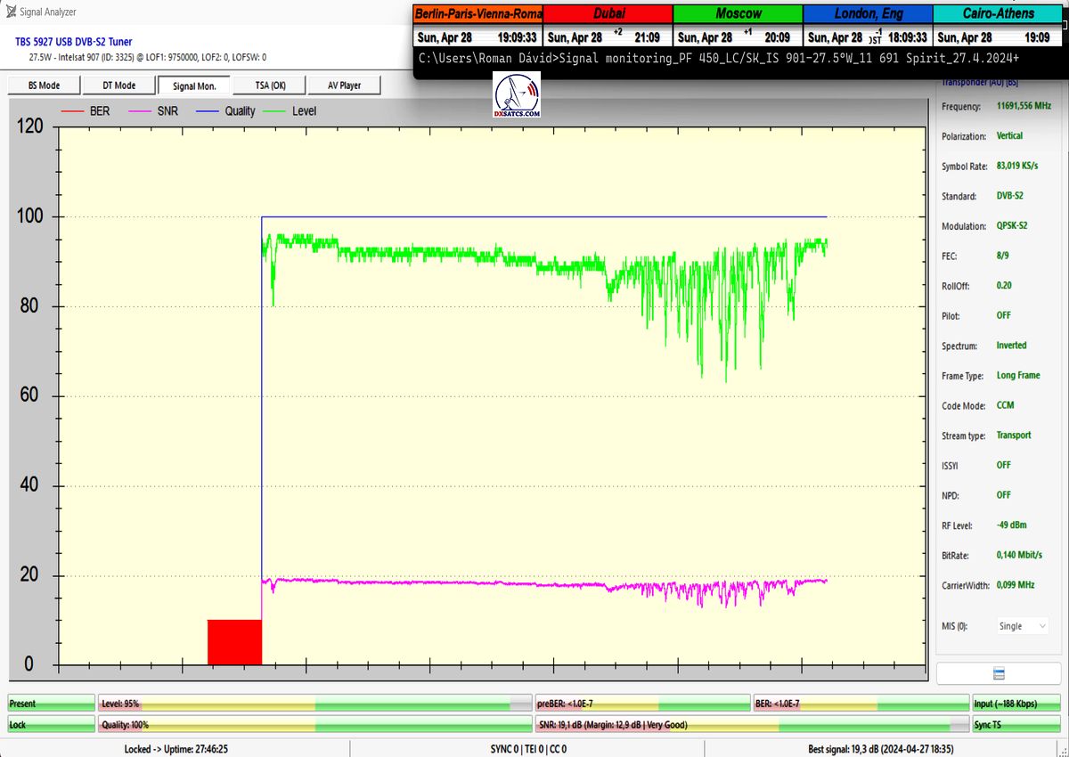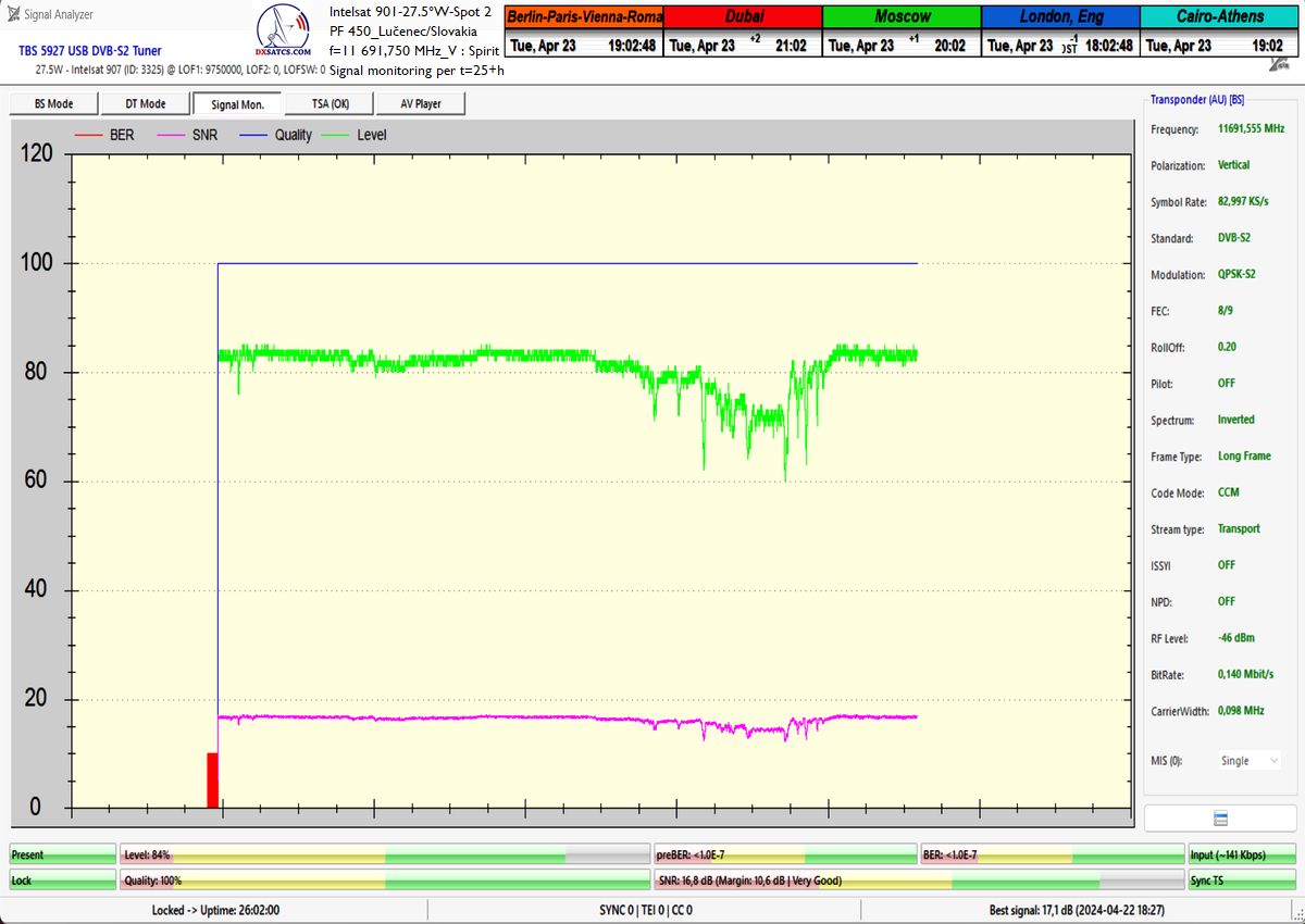 das Erreichen eines stabilen Empfangs (100%) auf der Frequenz f=11 691.750, die Spirit Radio mit SR=83 ksym/s belegt. Die volle Stabilität des Satellitenempfangs wurde selbst unter widrigen Wetterbedingungen,speziell am 24. April 2024,bestätigt. Die Spitzenqualität schwankte während
