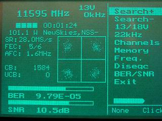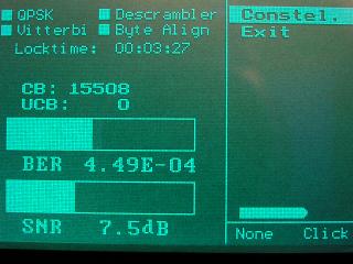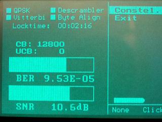Pri prvotnom ladení príjimacej antény na družici NSS 6 /95° východne/ bolo nevihnutné pootočiť konvertor, oproti vypočítanému sklonu polarizačnej roviny -41°, o ďalších 20°, lebo inak bolo možné príjimať len internetových provajderov PlanetSky, Streamlink, FalconStream a to tiež len na hranici signálnej stability. Televízie KTR a CGN sa zachytiť nedali vôbec. S použitím meracej techniky som čo najpresnejšie nastavil sklon polarizačnej roviny SKEW pri tomto konvertore. O dosiahnutých kvalitatívnych signálnych parametroch S/N,BER... s LNB INVACOM SNF 031 informujú nasledovné grafy a fotografie z meracieho prístroja.