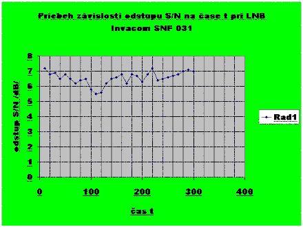 Obrázok č.5 nám znázorňuje závislosť zmeny kvality signálu meranú ako odstup S/N za časový úsek 5 minút pri LNB Invacom SNF 031. Kvalita signálu vykazovala výraznú nestabilitu a dokonca viac ako na 2.minúty sa obraz úplne stratil. Pri poklese odstupu S/N na 6 dB a BER pod hodnotu 2 krát 10 na -4 sa začal obraz rozpadať až sa úplne stratil. Tento proces sa s týmto konvertorom v závislosti na čase neustále opakoval a ani zamena počasia /vyjasnenie/ a opätovná kontrola nastavenia parametru SKEW nemala vplyv na zlepšenie odstupu S/N.