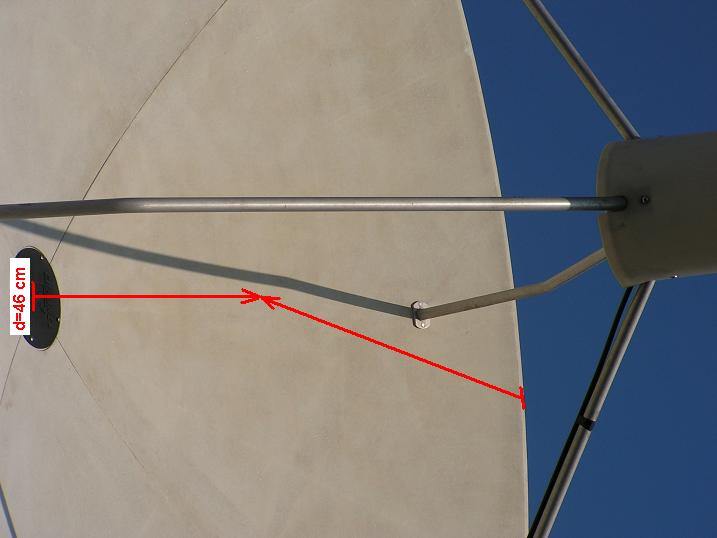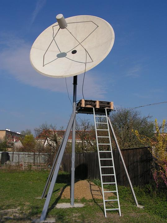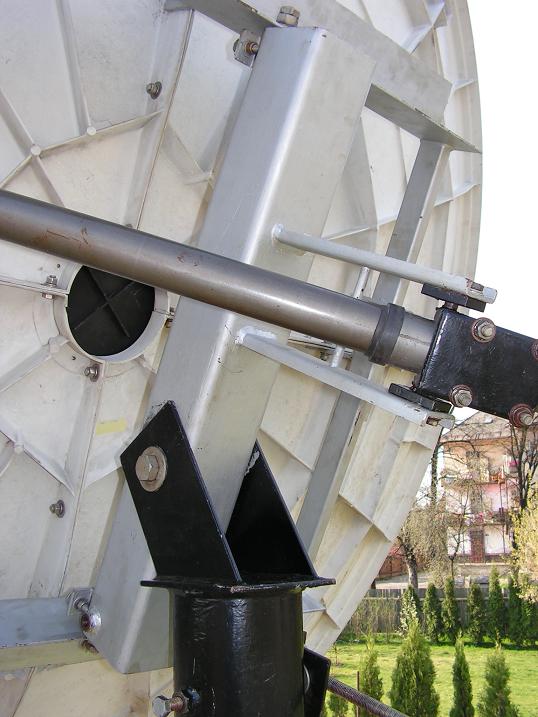 Jedná sa o stredové prevedenie anténneho tvaru v zapojení RX,ktorý je tvorený zo 4 segmentov.Vysoká tvarová stálosť a pevnosť celej reflektorovej plochy,čo prioritne súvisí ako som to vyššie popisoval s najdôležitejším parametrom ,ktorým je dosiahnutý zisk pri vysokej smerovosti, je odvodená od použitého materiálu,ktorým je FIBERGLASS-sklenené vlákno-sklolaminát , ktorý pri vysokej tvarovej stálosti odoláva veľkým tepelným zmenám a tým pádom garantuje stálosť signálnej kvality,vďaka pevnému rebrovaniu z opačnej strany reflektora.Podsatným faktorom pri tomto priemere 300 cm je aj samotná hmotnosť jednotlivých segmentov ,ktorá nepresahuje 25 kg,čo mi podstatným spôsobom uľahčovalo montáž celého reflektora,ktorý dve osoby zvládnu za necelých 60 minút.Podpornú štruktúru nosníka LNB tvoria 4 ks duralových trubiek s dostatočným priemerom ,ktorý dokáže stabilizovať aj kombinované riešenia na spracovanie C/KU pásma s hmotnosť viac ako 5 kg.Originálnou súčasťou celého anténneho kompletu je aj ochranný kryt LNB proti poveternostným vplyvom s medzikruhom pre C pásmový skalárny prstanec,ktorý ako to vidno na obrázku vytvára dokonalý jednoliaty celok,ktorý sa v súčastnej komerčnej praxi vyskytuje len zriedka.Celá poloha ochranného krytu je navyše fixovaná 4.skrutkami.K anténe výrobca dodával originálny polárny záves PLM,ktorý je mimoriadne pevný a jediným zásahom ,ktorý som musel vykonať je prerobenie dĺžky závitovej tyče polárneho uhla resp.elevačného uhla, nakoľko jeho pôvodná poloha neumožňovala zadefinovať NULOVÝ BOD v mieste príjmu,čím je družica Astra 19,2°E.Na zmeny azimutu som nainštaloval bežný tiahlový motor v dĺžke výsuvnej tyče 36 palcov-91 cm,ktorý aj v najkrajnejších azimutálnych polohách v ktorých naň pôsobí najväčší odpor dokázal bez problémou definovať polohu celej zostavy s hmotnosťou okolo 150 kg.Celé fixovanie anténnej zostavy na nosnej rúre s priemerom 114 mm a s dĺžkou 500 cm nad zemským povrchom,je účinne stabilizované rúrou s vnútorným priemerom 130 mm a s dĺžkou 100 cm na ktorej sa nachádza 10 stabilizačných skrutiek M12.Celý T kĺb je fixovaný mohutným šróbom M22. Zložený reflektor antény je fixovaný k polárnemu závesu pomocou štyroch profilov tvaru L z pásoviny s hrúbkou 8 mm.Po zložení celého systému polárneho závesu celok vykazoval vysokú konštrukčnú pevnosť čo mi umožňovalo prejsť k tomu najdôležitejšiemu - zadefinovaniu ohnniskovej vzdialenosti "f" načom stojí celý zisk antény v kombinácii so správnym nastavením PLM.