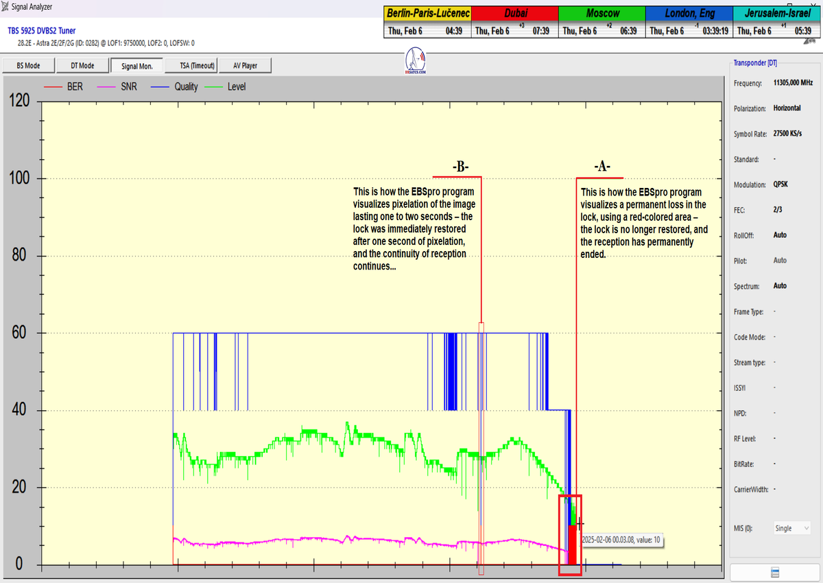 ►-A-:This is how the EBSpro program visualizes a permanent loss in the lock, using a red-colored area – the lock is no longer restored, and the reception has permanently ended...represents a major/enormous problem
