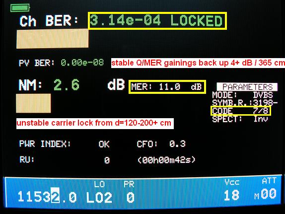 -ak hladinu uzamknutia QPSK nosnej okolo MER=7 dB pomenujem detekčný medzistav bez reálne prítomnej ziskovej hladiny resp. zálohy , potom okamžitý akostný stav v Q/MPEG-2 analýze vyjadruje reálny ziskový rast resp. zálohu pred rozpadom obrazu okolo 4 dB , čo v praxi znamená pri miernej oscilácii Q/MER amplitúdy v pásme rozkmitu +/- 0,2 dB stabilný stav príjmu aj pri mierne zhoršených poveternostných podmienkach .