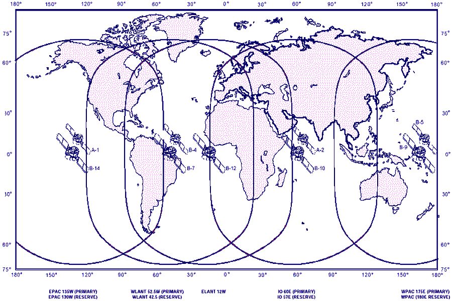 135°W+52.5°W+12W+60°E+175°E,komunikujúcich v L,X,KA ai pásmach a ktorých globálne signálne pokrytie je